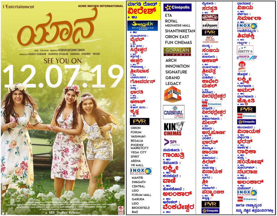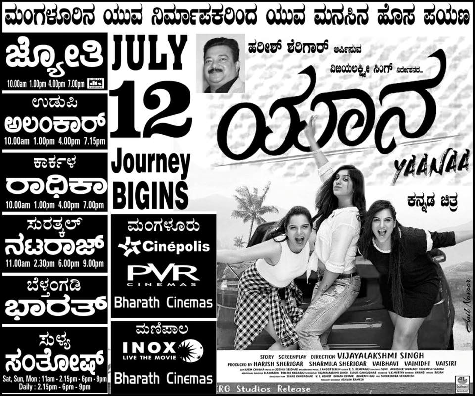 ಮಂಗಳೂರು, ಜುಲೈ.12 ; ACME ಮೂವೀಸ್ ಇಂಟರ್ನ್ಯಾಷನಲ್ ಬ್ಯಾನರಿನಡಿಯಲ್ಲಿ ಮಂಗಳೂರು ಮೂಲದ ದುಬೈಯ ಹೆಸರಾಂತ ಉದ್ಯಮಿ, ‘ಮಾರ್ಚ್ 22’, ‘ಹೊಟ್ಟೆಗಾಗಿ ಗೇಣು ಬಟ್ಟೆಗಾಗಿ’ ಕನ್ನಡ ಚಿತ್ರ ಮತ್ತು “ಇಂಗ್ಲೀಷ್” ತುಳು ಚಿತ್ರದ ನಿರ್ಮಾಪಕರೂ ಆಗಿರುವ ಹರೀಶ್ ಶೇರಿಗಾರ್ ಮತ್ತು ಶರ್ಮಿಳಾ ಶೇರಿಗಾರ್ ಹಾಗು ‘ಐ’ ಎಂಟರ್ಟೈನ್ಮೆಂಟ್’ನ ವೈಭವಿ, ವೈನಿಧಿ ಮತ್ತು ವೈಸಿರಿ ನಿರ್ಮಿಸಿರುವ, ವಿಜಯಲಕ್ಷ್ಮಿ ಸಿಂಗ್ ನಿರ್ದೇಶನದ ಬಹುನಿರೀಕ್ಷಿತ “ಯಾನ” ಕನ್ನಡ ಚಿತ್ರ ಇಂದು ಜುಲೈ 12ರ ಶುಕ್ರವಾರದಂದು ಕರ್ನಾಟಕ ರಾಜ್ಯದಾದ್ಯಂತ ಬಿಡುಗಡೆಗೊಂಡಿತು.