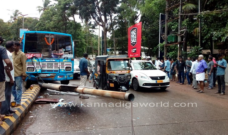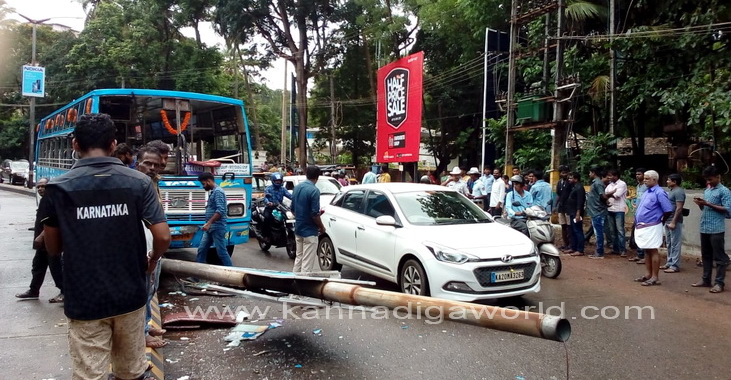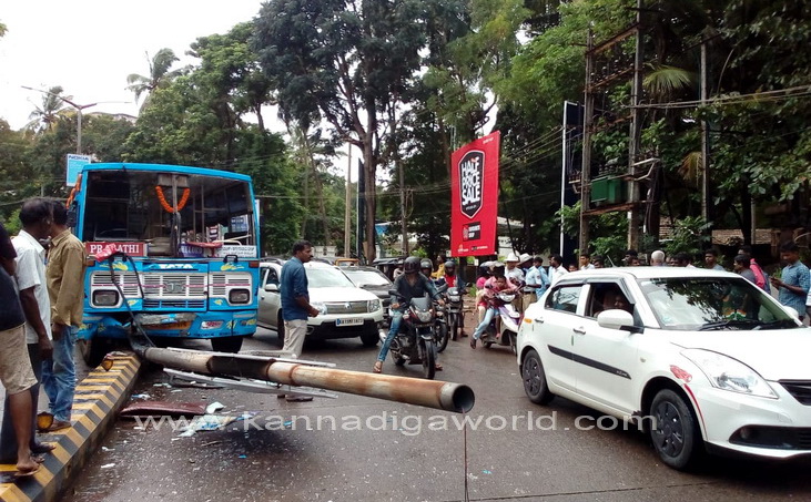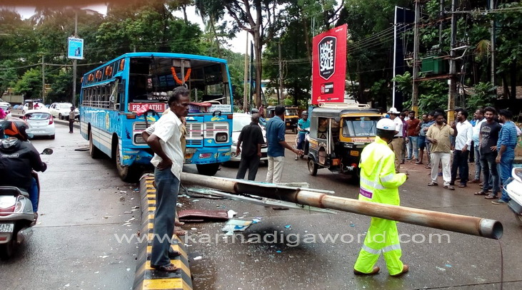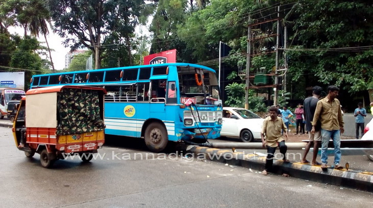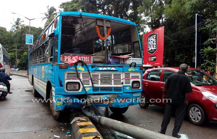 ತಣ್ಣೀರುಬಾವಿಯಿಂದ ಲೇಡಿಹಿಲ್, ಲಾಲ್ಭಾಗ್ ಪಿವಿಎಸ್ ಮಾರ್ಗವಾಗಿ ಸ್ಟೇಟ್ಬ್ಯಾಂಕ್ಗೆ ತೆರಳಬೇಕಿದ್ದ ಖಾಸಗಿ ಬಸ್ ಲಾಲ್ಬಾಗ್ ಸಮೀಪದ ಪಬ್ಬಸ್ ಐಸ್ಕ್ರೀಸ್ ಮಳಿಗೆ ಮುಂಭಾಗದ ರಸ್ತೆಯ ಡಿವೈಡರ್ ಮೇಲೆ ಹತ್ತಿ, ಬೀದಿದೀಪದ ವಿದ್ಯುತ್ ಕಂಬಕ್ಕೆ ಢಿಕ್ಕಿ ಹೊಡೆದಿದೆ. ಘಟನೆಯಲ್ಲಿ ರಸ್ತೆಯ ಡಿವೈಡರ್ಗೆ ಹಾನಿಯಾಗಿದೆ. ಅಲ್ಲದೆ, ವಿದ್ಯುತ್ ಕಂಬವು ಮುರಿದು ಬಿದ್ದಿದ್ದು, ಸಂಪೂರ್ಣ ಜಖಂಗೊಂಡಿದೆ. ಬಸ್ನ ಅತಿಯಾದ ವೇಗವೇ ಅವಘಾತಕ್ಕೆ ಕಾರಣ ಎಂದು ದೂರಿನಲ್ಲಿ ತಿಳಿಸಲಾಗಿದೆ.