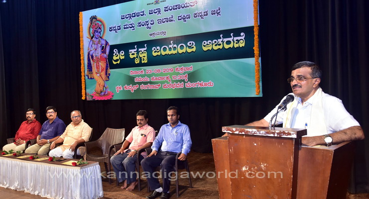 ದಕ್ಷಿಣ ಕನ್ನಡ ಜಿಲ್ಲಾಡಳಿತ, ದ.ಕ ಜಿಲ್ಲಾ ಪಂಚಾಯತ್ ಹಾಗೂ ಕನ್ನಡ ಮತ್ತು ಸಂಸ್ಕೃತಿ ಇಲಾಖೆ ಇವರ ವತಿಯಿಂದ ಶುಕ್ರವಾರ ನಗರದ ಪುರಭವನದಲ್ಲಿ ನಡೆದ ಶ್ರೀ ಕೃಷ್ಣ ಜಯಂತಿ ಆಚರಣೆಯ ಉದ್ಘಾಟನೆ ನಡೆಸಿ ಮಾತನಾಡಿದ ಅವರು, ಶ್ರೀ ಕೃಷ್ಣ ಕೇವಲ ಒಂದು ಜನಾಂಗಕ್ಕೆ ಮಾತ್ರ ಸೀಮಿತರಾದವರಲ್ಲ, ಆತ ಮನುಕುಲಕ್ಕೆ ಪ್ರೇರಣಾತ್ಮಕ ಶಕ್ತಿ. .ಭಗವದ್ಗೀತೆ ಮನಕುಲದ ಸರ್ವಧರ್ಮದ ಸಾರ. ಕೃಷ್ಣನ ಚಿಂತನೆ ಜಗತ್ತಿಗೆ ಮೀಸಲಾಗುವಂತಹದು. ವಿದ್ಯಾರ್ಥಿಗಳು ಇಂದಿನ ಕಾಲದಲ್ಲಿ ವಿದ್ಯಾಭ್ಯಾಸದ ಜೊತೆಗೆ ಇತರ ಜ್ಞಾನವನ್ನು ಪಡೆದುಕೊಳ್ಳಬೇಕು. ಶ್ರೀ ಕೃಷ್ಣ ಜನ್ಮಾಷ್ಟಮಿಯ ಪ್ರಯುಕ್ತ ಮಕ್ಕಳಿಗೆ ಕೃಷ್ಣ ರಾಧೆಯ ವೇಷ ತೊಡಿಸಿ ತಾಯಂದಿರು ಸಂಭ್ರಮಿಸುತ್ತಾರೆ ಎಂದರು.
