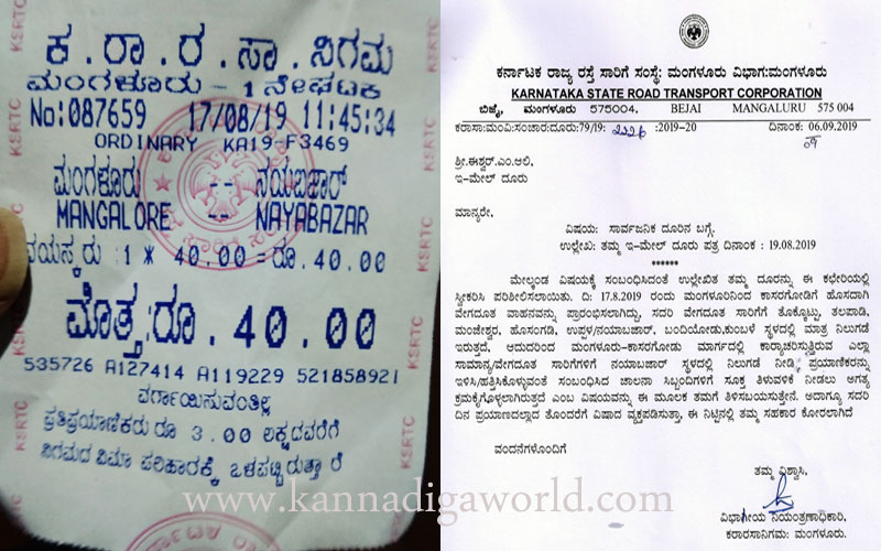 ಮಂಗಳೂರು : ಮಂಗಳೂರಿನ ಕಾಲೇಜು ವಿದ್ಯಾರ್ಥಿನಿಯೊಬ್ಬಳು ಅಗೋಷ್ಟು 17 ರಂದು ಮಂಗಳೂರಿನಿಂದ ಕಾಸರಗೋಡಿಗೆ ತೆರಳುತ್ತಿರುವ ಕರ್ನಾಟಕ ರಾಜ್ಯ ರಸ್ತೆ ಸಾರಿಗೆ ಸಂಸ್ಥೆಯ ಬಸ್ಸಲ್ಲಿ ಪ್ರಾಯಾಣಿಸಿದ್ದು ಟಿಕೇಟಿನಲ್ಲಿ ನಮೂದಿಸಿದಂತೆ ಉಪ್ಪಳ ಸಮೀಪದ ನಯಾಬಜಾರ್ ನಲ್ಲಿ ಇಳಿಯಬೇಕಿತ್ತು. ಆದರೆ ನಯಾಬಜಾರ್ ನಿಲ್ಢಾಣ ಬರುತ್ತಿದ್ದಂತೆಯೇ ಬಸ್ಸ್ ಕಂಡಕ್ಟರ್ ‘ಇಲ್ಲಿ ಸ್ಟಾಪ್ ಇಲ್ಲ’ ಎಂಬುದಾಗಿ ವಿದ್ಯಾರ್ಥಿನಿಗೆ ನಿರಾಕರಿಸಿದ್ದು ಆಕೆಯೊಂದಿಗೆ ಇತರ ಕೆಲವು ಪ್ರಯಾಣಿಕರು ಕಂಡಕ್ಟರಲ್ಲಿ ವಿನಂತಿಸಿದ ನಂತರವೇ ಟಿಕೇಟಲ್ಲಿ ನಮೂದಿಸಿದ ನಯಾಬಜಾರ್ ಸ್ಟಾಪ್ ನಿಂದ ದೂರ, ಮಂಗಲ್ಪಾಡಿ ಪಂಚಾಯತ್ ಕಚೇರಿ ಸಮೀಪ ಬಸ್ಸನ್ನು ನಿಲ್ಲಿಸಿ ಆಕೆಯನ್ನು ಇಳಿಸಲಾಯಿತು.