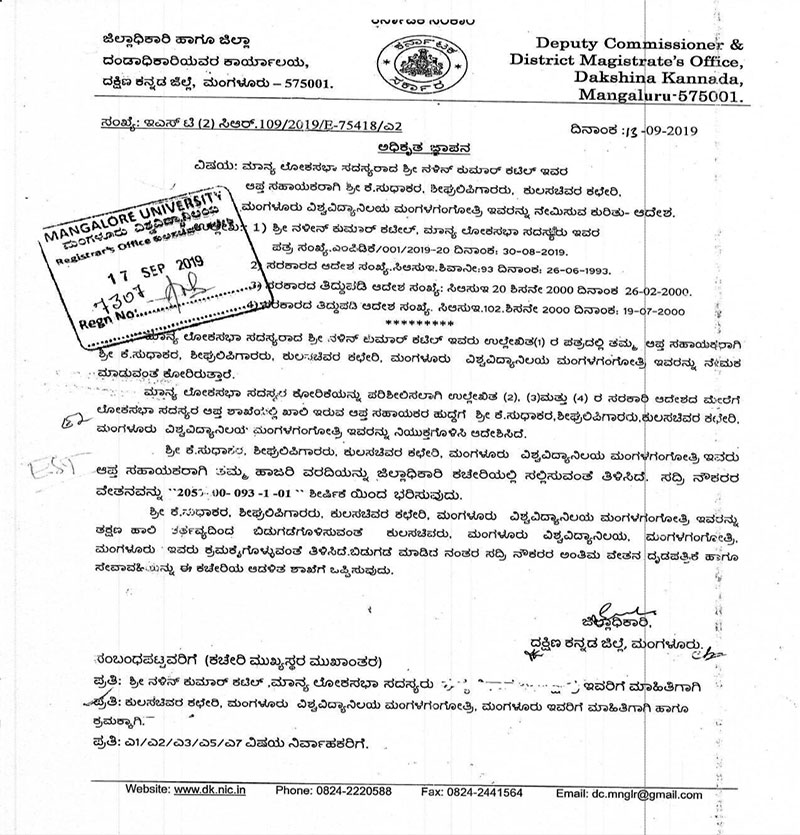 ಮಂಗಳೂರು :ದಕ್ಷಿಣ ಕನ್ನಡ ಲೋಕಸಭಾ ಸದಸ್ಯರಾದ ನಳಿನ್ ಕುಮಾರ್ ಕಟೀಲ್ ಇವರ ಆಪ್ತ ಸಹಾಯಕರಾಗಿ ಮಂಗಳೂರು ವಿಶ್ವವಿದ್ಯಾನಿಲಯದಿಂದ ಪ್ರತಿನಿಯೋಜನೆ ಮೇರೆಗೆ ಕೆ. ಸುಧಾಕರ ಇವರನ್ನು ಲೋಕಸಭಾ ಸದಸ್ಯರ ಕೋರಿಕೆಯಂತೆ ಜಿಲ್ಲಾಧಿಕಾರಿಯವರು ನೇಮಕ ಮಾಡಿದ್ದಾರೆ.