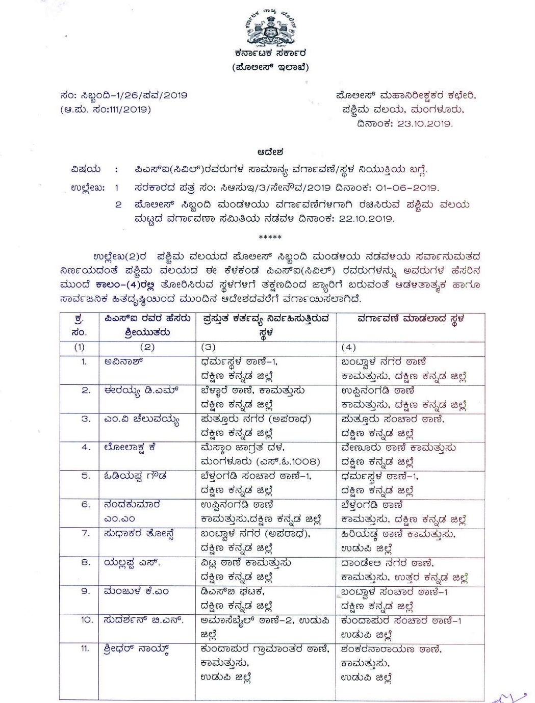 ಉಡುಪಿ: ಪೊಲೀಸ್ ಇಲಾಖೆಯ ಪಶ್ಚಿಮ ವಲಯದ ಪೊಲೀಸ್ ಸಿಬ್ಬಂದಿ ಮಂಡಳಿಯ ನಡಾವಳಿಯ ಸರ್ವಾನುಮತದ ನಿರ್ಣಯದಂತೆ ಈ ವಲಯಕ್ಕೆ ಒಳಪಡುವ ಚಿಕ್ಕಮಗಳೂರು, ಮಂಗಳೂರು, ಉಡುಪಿ, ಹಾಗೂ ಉತ್ತರಕನ್ನಡ ಜಿಲ್ಲೆಗಳ ಒಟ್ಟು 47 ಮಂದಿ ಪೊಲೀಸ್ ಸಬ್ ಇನ್ಸ್ ಪೆಕ್ಟರ್ (ಪಿಎಸ್ಐ ಸಿವಿಲ್) ಗಳನ್ನು ವರ್ಗಾವಣೆಗೊಳಿಸಿ ಆದೇಶಿಸಲಾಗಿದೆ.