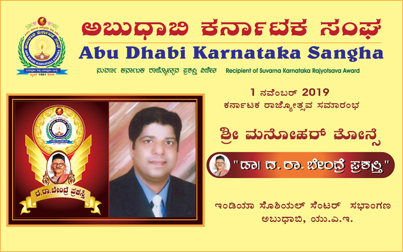 ಅಬುಧಾಬಿ ಕರ್ನಾಟಕ ಸಂಘದ ಪ್ರತಿಷ್ಠಿತ “ಡಾ.ದ.ರಾ. ಬೇಂದ್ರೆ ಪ್ರಶಸ್ತಿ ಶ್ರೀ ಮನೋಹರ್‌ತೋನ್ಸೆಯವರ ಮಡಿಲಿಗೆ