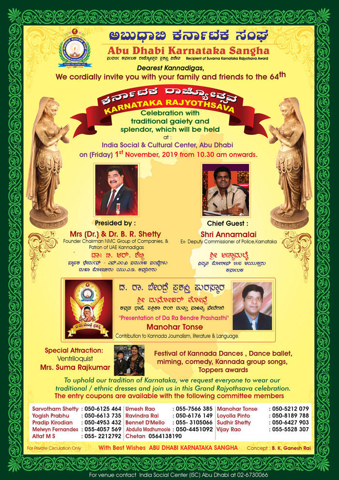ಅಬುಧಾಬಿ ಕರ್ನಾಟಕ ಸಂಘದ‌ಆಶ್ರಯದಲ್ಲಿ 2019 ನವೆಂಬರ್ 1ನೇ ತಾರೀಕು ಶುಕ್ರವಾರ ಬೆಳಿಗ್ಗೆ 10.30ರಿಂದ‌ಅಬುಧಾಬಿ ಇಂಡಿಯಾ ಸೋಶಿಯಲ್ ಸೆಂಟರ್ ಸಭಾಂಗಣದಲ್ಲಿ 64ನೇಕರ್ನಾಟಕರಾಜ್ಯೋತ್ಸವ ಸಮಾರಂಭ ನಡೆಯಲಿದೆ.