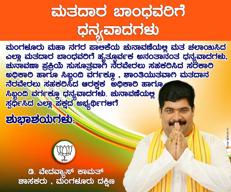 ಮಂಗಳೂರು, ನವೆಂಬರ್.13 : ಮಂಗಳೂರು ಮಹಾನಗರ ಪಾಲಿಕೆಯ ಚುನಾವಣೆಯಲ್ಲಿ ಮತ ಚಲಾಯಿಸಿದ ಎಲ್ಲಾ ಮತದಾರ ಬಾಂಧವರಿಗೆ ಹೃತ್ಪೂರ್ವಕ ಅನಂತಾನಂತ ಧನ್ಯವಾದಗಳನ್ನು ಸಲ್ಲಿಸುವುದಾಗಿ ಮಂಗಳೂರು ದಕ್ಷಿಣ ಶಾಸಕ ಡಿ.ವೇದವ್ಯಾಸ್ ಕಾಮತ್ ತಿಳಿಸಿದ್ದಾರೆ.