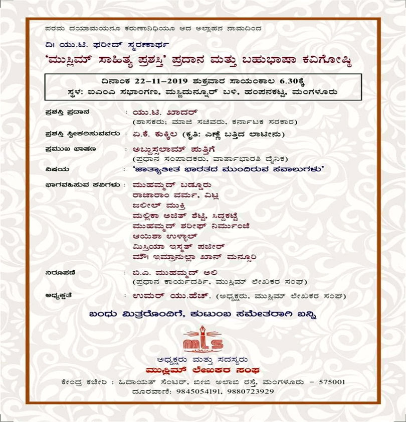 ನವೆಂಬರ್.22ರಂದು ಮಂಗಳೂರಿನಲ್ಲಿ ‘ಮುಸ್ಲಿಮ್ ಸಾಹಿತ್ಯ ಪ್ರಶಸ್ತಿ’ ಪ್ರದಾನ ಮತ್ತು ಬಹುಭಾಷಾ ಕವಿಗೋಷ್ಟಿ