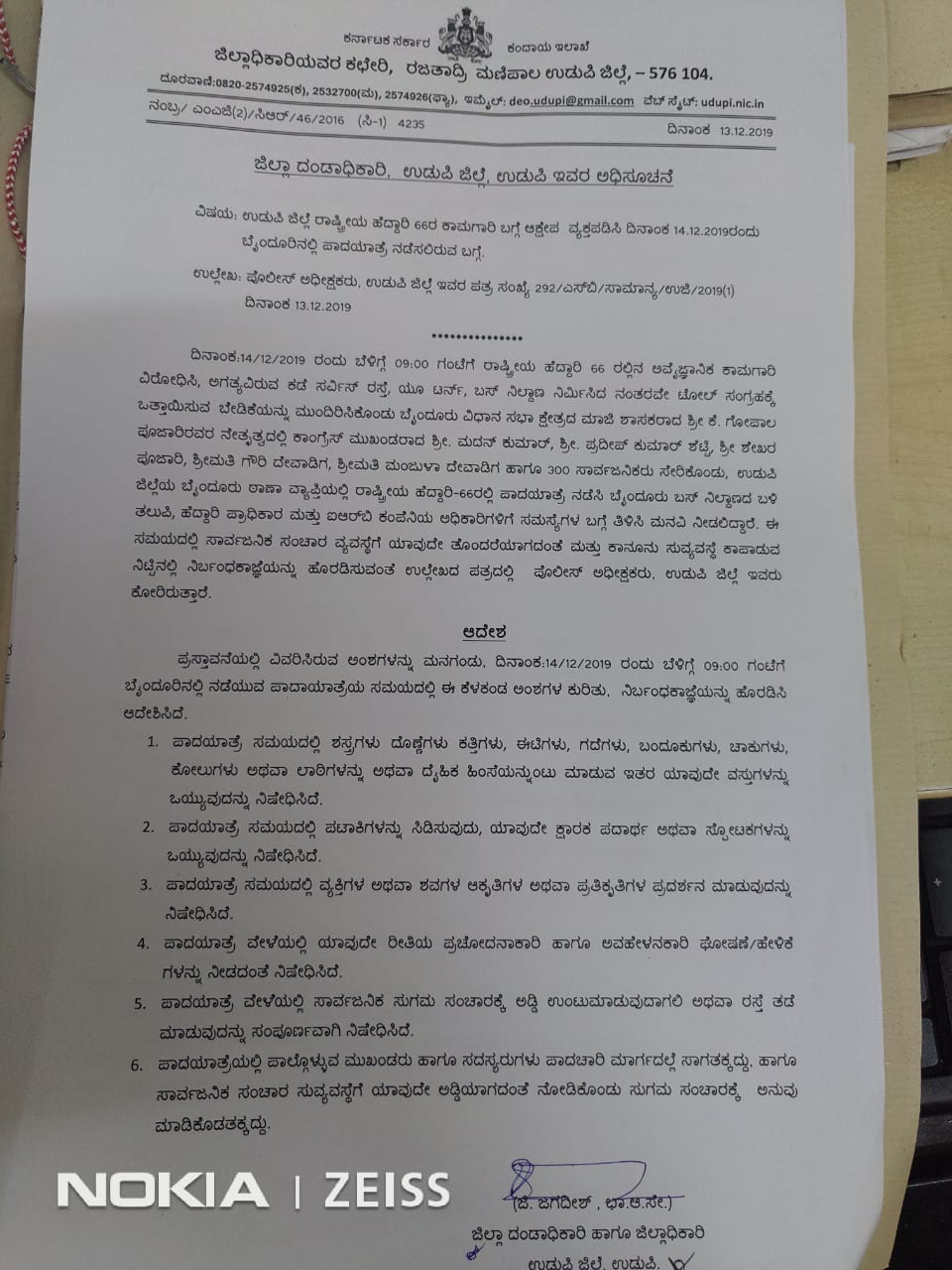 ಪಾದಯಾತ್ರೆ ನಡೆಯುವ ಸಂದರ್ಭ ದೊಣ್ಣೆ, ಕತ್ತಿ, ಈಟಿ, ಗದೆ, ಬಂದೂಕು, ಚಾಕು, ಕೋಲು, ಲಾಠಿ ಮತ್ತು ದೈಹಿಕ ಹಿಂಸೆಯಾಗುವ ಆಯುಧ ಬಳಸುವಂತಿಲ್ಲ. ಪಟಾಕಿ ಸಿಡಿಸುವುದು, ಸ್ಫೋಟಕ ಉಪಯೋಹಿಸುವಂತಿಲ್ಲ. ಯಾವುದೇ ವ್ಯಕ್ತಿ, ಶವದ ಆಕೃತಿ, ಪ್ರತಿಕೃತಿ ಪ್ರದರ್ಶನ ಮಾಡುವಂತಿಲ್ಲ. ಪ್ರಚೋದನಕಾರಿ, ಅವಹೇಳನಕಾರಿ ಘೋಷಣೆ ಕೂಗುವಂತಿಲ್ಲ. ಪಾದಯಾತ್ರೆ ಸಂದರ್ಭ ಪಾದಾಚಾರಿ ಮಾರ್ಗದಲ್ಲಿ ಸಂಚರಿಸಬೇಕು, ಯಾವುದೇ ವಾಹನಗಳ ಸಂಚಾರಕ್ಕೆ ತೊಡಕು ಮಾಡಬಾರದು ‌ಮತ್ತು ರಸ್ತೆ ತಡೆ ಮಾಡುವುದನ್ನು ಸಂಪೂರ್ಣ ನಿಷೇಧಿಸಲಾಗಿದೆ.