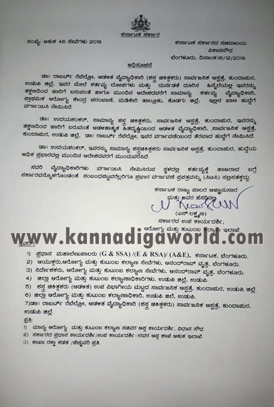ಕುಂದಾಪುರ ತಾಲೂಕು ಅಸ್ಪತ್ರೆಗೆ ಮುಂದಿನ ಆದೇಶ ಬರುವ ತನಕ ಸಾಮಾನ್ಯ ಶಸ್ತ್ರ ಚಿಕಿತ್ಸಕ ಡಾ.ಉದಯಶಂರ್ ಅವರನ್ನು ಪ್ರಭಾರ ವೈದ್ಯಾಧಿಕಾರಿಯಾಗಿ ನೇಮಕ ಮಾಡಲಾಗಿದೆ.