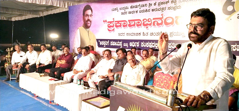 ಅಪೂರ್ವ ಸಾಧಕ ಕೆ. ಪ್ರಕಾಶ್ ಶೆಟ್ಟಿ ಅವರ 60ರ ಸಂಭ್ರಮದ ಹಿನ್ನೆಲೆಯಲ್ಲಿ ಡಿ. 25ರಂದು ಗೋಲ್ಡ್ಫಿಂಚ್ ಸಿಟಿಯಲ್ಲಿ ನಡೆಯುವ “ಪ್ರಕಾಶಾಭಿನಂದನ 60ರ ಸಂಭ್ರಮ’ ಕಾರ್ಯಕ್ರಮದ ಪೂರ್ವಭಾವಿಯಾಗಿ ಬಂಗ್ರಕೂಳೂರಿನ ಗೋಲ್ಡ್ಫಿಂಚ್ ಸಿಟಿಯಲ್ಲಿ ಗುರುವಾರ ಸಂಜೆ ನಡೆದ ಅಶಕ್ತರು ಮತ್ತು ಆರ್ಥಿಕವಾಗಿ ಹಿಂದುಳಿದ ವಿದ್ಯಾರ್ಥಿಗಳಿಗೆ ನೆರವು ನೀಡುವ ಕಾರ್ಯಕ್ರಮವನ್ನು ಉದ್ಘಾಟಿಸಿ ಅವರು ಮಾತನಾಡಿದರು. ಮುಂದಿನ ವರ್ಷದಿಂದ ಡಾ| ಎಂ. ಮೋಹನ ಆಳ್ವರ ನೇತೃತ್ವದಲ್ಲಿ ಪ್ರತಿ ಡಿ. 19ರಂದು 1 ಕೋ.ರೂ. ನೆರವು ನೀಡಬೇಕೆಂದು ನಿಶ್ಚಯಿಸಿದ್ದೇನೆ ಎಂದು ಅವರು ಹೇಳಿದರು.