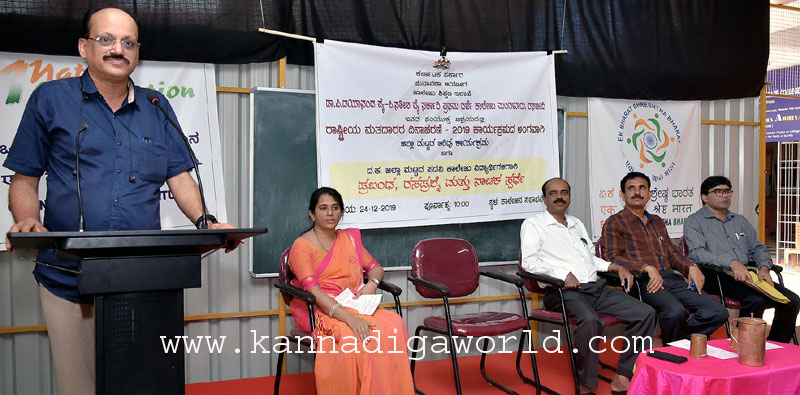 ಮಂಗಳೂರು ಡಿಸೆಂಬರ್ 30 :ಕರ್ನಾಟಕ ಸರ್ಕಾರ, ಚುನಾವಣಾ ಆಯೋಗ, ಕಾಲೇಜು ಶಿಕ್ಷಣ ಇಲಾಖೆ, ದಕ್ಷಿಣ ಕನ್ನಡ ಜಿಲ್ಲಾಡಳಿತ ಹಾಗೂ ಡಾ.ಪಿ.ದಯಾನಂದ ಪೈ-ಪಿ.ಸತೀಶ ಪೈ ಸರ್ಕಾರಿ ಪ್ರಥಮ ದರ್ಜೆ ಕಾಲೇಜು ರಥಬೀದಿ ಮಂಗಳೂರು ಇವರ ಸಂಯುಕ್ತ ಆಶ್ರಯದಲ್ಲಿ ರಾಷ್ಟ್ರೀಯ ಮತದಾರರ ದಿನಾಚರಣೆ- 2019 ರ ಕಾರ್ಯಕ್ರಮದ ಅಂಗವಾಗಿ ದಕ್ಷಿಣ ಕನ್ನಡ ಜಿಲ್ಲಾ ಮಟ್ಟದ ಪದವಿ ಕಾಲೇಜು ವಿದ್ಯಾರ್ಥಿಗಳಿಗಾಗಿ ಮತದಾರರ ಅರಿವು ಹಾಗೂ ಕನ್ನಡ ಮತ್ತು ಇಂಗ್ಲೀಷ್ ಪ್ರಬಂಧ ಸ್ಫರ್ಧೆ, ರಸಪ್ರಶ್ನೆ ಹಾಗೂ ನಾಟಕ ಸ್ಫರ್ಧಾ ಕಾರ್ಯಕ್ರಮವನ್ನು ನಡೆಸಲಾಯಿತು.