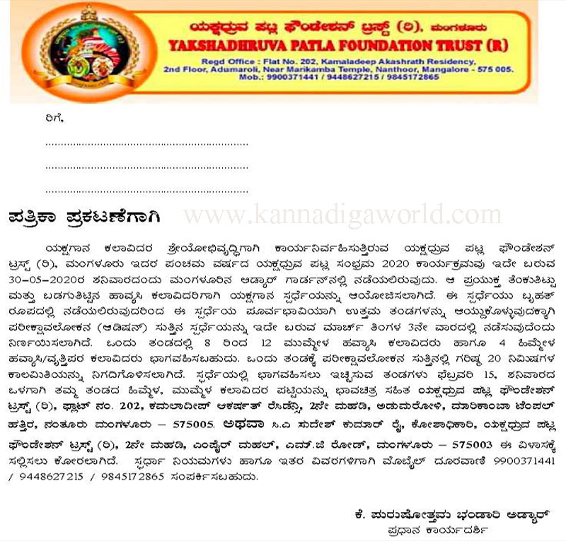 ಸ್ಫರ್ಧಾ ನಿಯಮಗಳು ಹಾಗೂ ಇತರ ವಿವರಗಳಿಗಾಗಿ ಮೊಬೈಲ್ ದೂರವಾಣಿ ೯೯೦೦೩೭೧೪೪೧ / ೯೪೪೮೬೨೭೨೧೫/ ೯೮೪೫೧೭೨೮೬೫ ಸಂಪರ್ಕಿಸಬಹುದಾ ಗಿದೆ ಎಂದು ಯಕ್ಷಧ್ರುವ ಪಟ್ಲ ಫೌಂಡೇಶನ್ ಟ್ರಸ್ಟ್ನ ಸ್ಥಾಪಕಾಧ್ಯಕ್ಷ ಸತೀಶ್ ಶೆಟ್ಟಿ ಪಟ್ಲ ಪ್ರಕಟಣೆಯಲ್ಲಿ ತಿಳಿಸಿದ್ದಾರೆ.