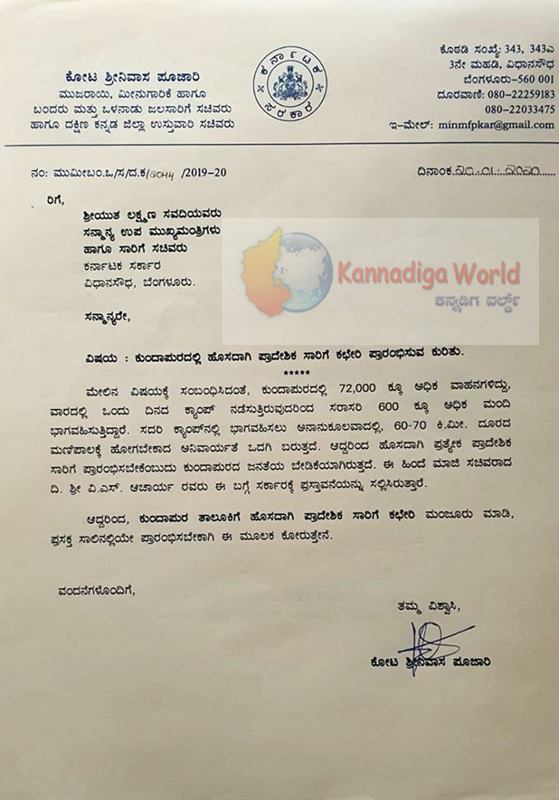 ಸಚಿವ ಕೋಟ ಶ್ರೀನಿವಾಸ ಪೂಜಾರಿಯವರು ಕುಂದಾಪುರದಲ್ಲಿ ಪ್ರಾದೇಶಿಕ ಸಾರಿಗೆ ಕಚೇರಿ ಆರಂಭಿಸಬೇಕು ಎನ್ನುವ ಕುರಿತಂತೆ ಉಪಮುಖ್ಯಮಂತ್ರಿ, ಸಾರಿಗೆ ಸಚಿವ ಲಕ್ಷ್ಮಣ ಸವದಿ ಅವರಿಗೆ ಪತ್ರ ಬರೆದಿದ್ದಾರೆ. ಕುಂದಾಪುರದಲ್ಲಿ 72 ಸಾವಿರಕ್ಕೂ ಅಧಿಕ ವಾಹನಗಳಿದ್ದು, ವಾರದಲ್ಲಿ ಒಂದು ದಿನದ ಕ್ಯಾಂಪ್ ನಡೆಸುವುದರಿಂದ ಸರಾಸರಿ 600 ಕ್ಕೂ ಅಧಿಕ ಮಂದಿ ಪ್ರಯೋಜನ ಪಡೆಯುತ್ತಿದ್ದಾರೆ. ತಪ್ಪಿದಲ್ಲಿ ಅವರೆಲ್ಲ 60-70 ಕಿ.ಮೀ. ದೂರದ ಮಣಿಪಾಲಕ್ಕೆ ಹೋಗಬೇಕು. ಆದ್ದರಿಂದ ಹೊಸದಾಗಿ ಪ್ರತ್ಯೇಕ ಪ್ರಾದೇಶಿಕ ಸಾರಿಗೆ ಕಚೇರಿ ಪ್ರಾರಂಭಿಸಬೇಕು ಎನ್ನುವುದು ಕುಂದಾಪುರದ ಜನತೆಯ ಬೇಡಿಕೆಯಾಗಿದ್ದು, ಕುಂದಾಪುರಕ್ಕೆ ಕಚೇರಿ ಮಂಜೂರು ಮಾಡಿ, ಈ ಸಾಲಿನಲ್ಲಿಯೇ ಪ್ರಾರಂಭಿಸಬೇಕು ಎಂದು ಪತ್ರದಲ್ಲಿ ಮನವಿ ಮಾಡಿಕೊಂಡಿದ್ದಾರೆ.