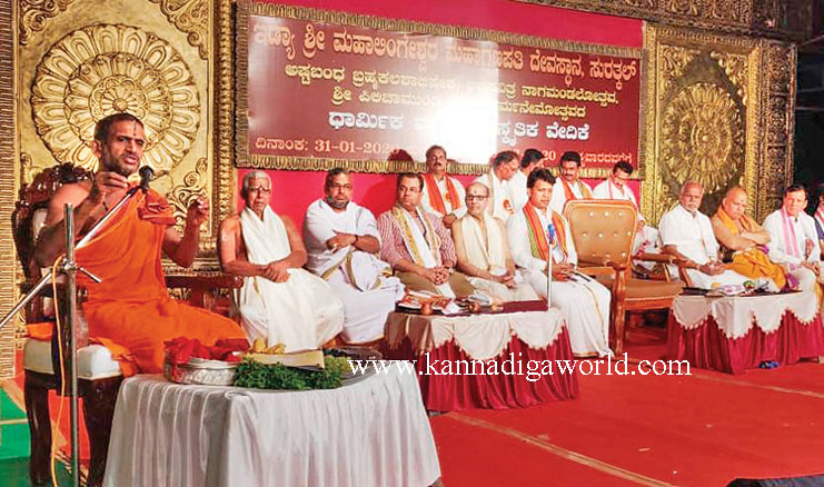 ಬಳಿಕ ಬ್ರಹ್ಮಕಲಶೋತ್ಸವ ಹಾಗೂ ನಾಗಮಂಡಲೋತ್ಸವ ಪ್ರಯುಕ್ತ ಶುಕ್ರವಾರ ನಡೆದ ಧಾರ್ಮಿಕ ಸಭೆಯಲ್ಲಿ ಪೇಜಾವರ ಮಠದ ಶ್ರೀ ವಿಶ್ವಪ್ರಸನ್ನತೀರ್ಥ ಸ್ವಾಮೀಜಿ ಆಶೀರ್ವಚನ ನೀಡಿದರು. ಬ್ರಹ್ಮಕಲಶೋತ್ಸವದಿಂದ ಒಂದು ದೇವಸ್ಥಾನ ಮಾತ್ರವಲ್ಲದೆ ಗ್ರಾಮವಿಡೀ ಕಳೆಗಟ್ಟುತ್ತದೆ; ಅಭಿವೃದ್ಧಿಯಾಗುತ್ತದೆ. ಬ್ರಹ್ಮಕಲಶೋತ್ಸವದಲ್ಲಿ ಪಾಲ್ಗೊಂಡು ಹಿಂದಿರುಗಿದರೆ ನಮ್ಮ ಜೀವನದಲ್ಲಿ ನಿತ್ಯೋತ್ಸವವೇ ತುಂಬಿರುತ್ತದೆ ಎಂದು ಹೇಳಿದರು.
