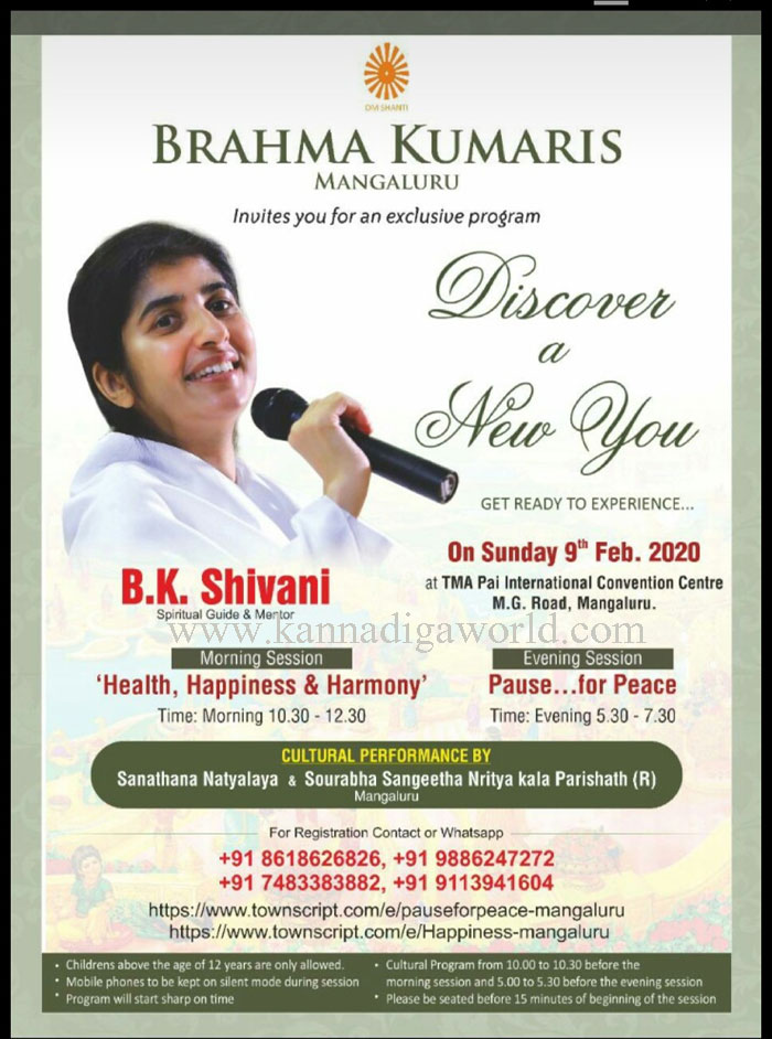 ಯು ಟ್ಯೂಬ್ ಹಾಗೂ ಫೇಸ್ ಬುಕ್ನಲ್ಲಿ ಮಿಲಿಯಾಂತರ ಅಭಿಮಾನಿಗಳನ್ನು ಹೊಂದಿರುವ ಬ್ರಹ್ಮಾಕುಮಾರಿ ಶಿವಾನಿಯವರು ಫೆಬ್ರುವರಿ 9ರಂದು ನಗರದ ಟಿ.ಎಮ್.ಎ. ಪೈ ಕನ್ವೆಷನ್ ಸೆಂಟರ್ನ ನಲ್ಲಿ ನೀಡಲಿರುವ ಆಧ್ಯಾತ್ಮಿಕ ಉಪನ್ಯಾಸ ಕಾರ್ಯಕ್ರಮದಲ್ಲಿ, ಮಂಗಳೂರಿನ ಜನತೆ ಹೆಚ್ಚಿನ ಸಂಖ್ಯೆಯಲ್ಲಿ ಭಾಗವಹಿಸಿ ಸದ್ವಿನಿಯೋಗಗೊಳಿಸಬೇಕೆಂದು ಮಂಗಳೂರಿನ ಪ್ರಜಾಪಿತ ಬ್ರಹ್ಮಾಕುಮಾರಿ ಈಶ್ವರೀಯ ವಿಶ್ವ ವಿದ್ಯಾಲಯದ ಬಿ ಕೆ ವಿಶ್ವೇಶ್ವರಿಯವರು ವಿನಂತಿಸಿದ್ದಾರೆ.
