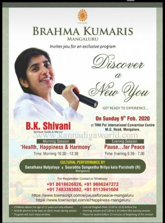 ಫೆಬ್ರುವರಿ,09 : ಬ್ರಹ್ಮಾಕುಮಾರಿ ಶಿವಾನಿಯವರಿಂದ ಮಂಗಳೂರಿನಲ್ಲಿ ಆಧ್ಯಾತ್ಮಿಕ ಪ್ರವಚನ