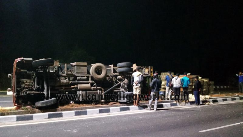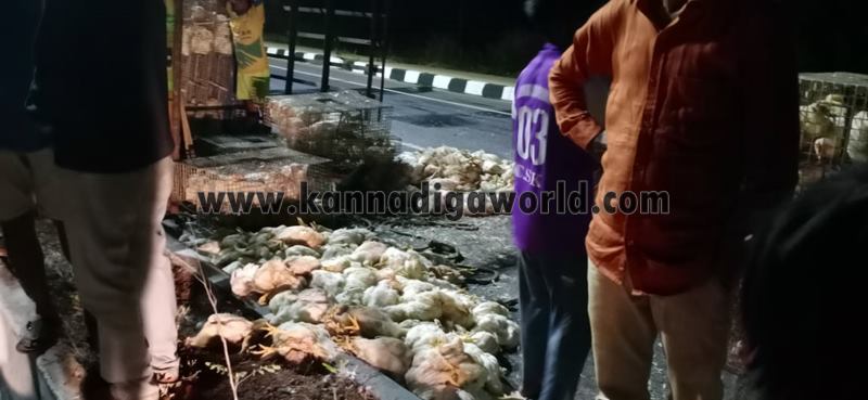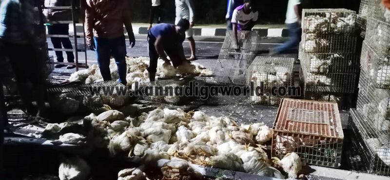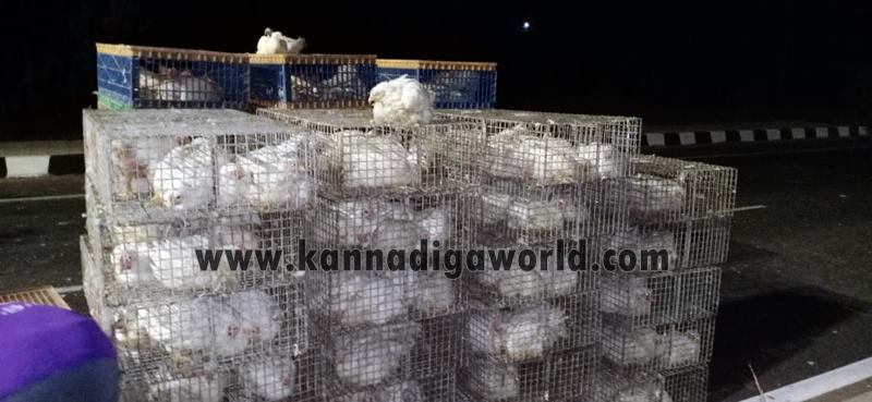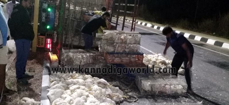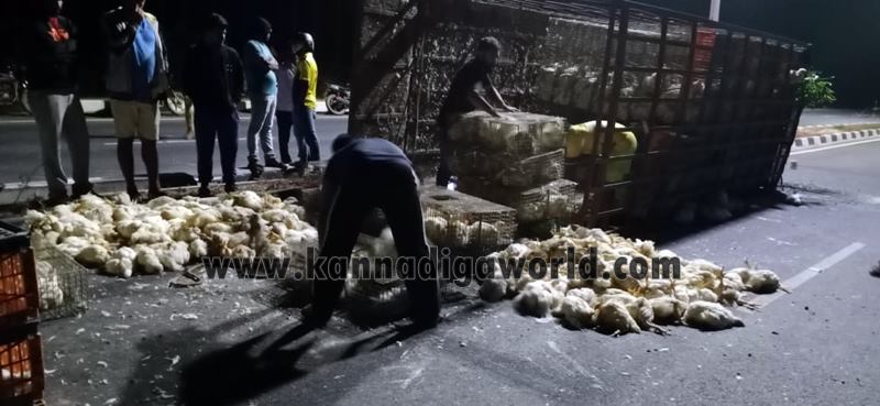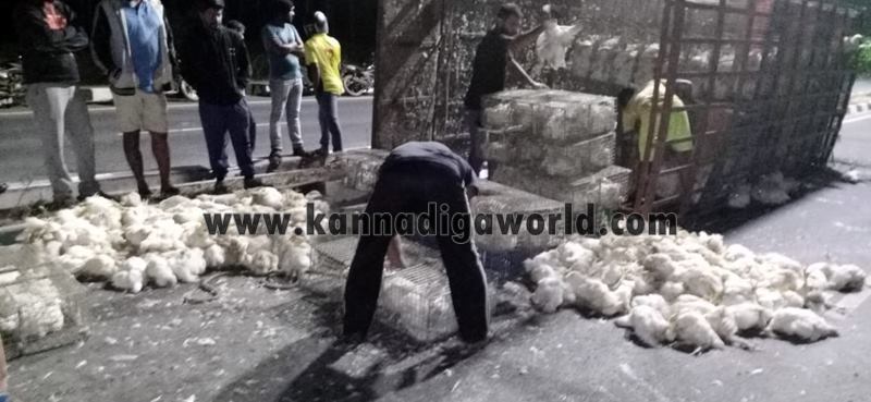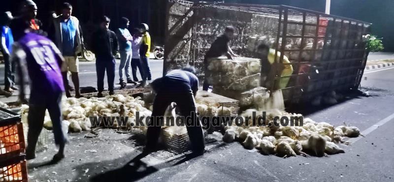 ಹುಬ್ಬಳ್ಳಿ ಮೂಲದ ಲಾರಿ ಇದಾಗಿದ್ದು ಫಾರಂ ಕೋಳಿಗಳನ್ನು ಮಂಗಳೂರಿಗೆ ಸಾಗಿಸುವ ಮಾರ್ಗಮದ್ಯೆ ಚಾಲಕನ ನಿಯಂತ್ರಣ ತಪ್ಪಿದ ಲಾರಿಯು ರಸ್ತೆ ವಿಭಾಜಕ ಮದ್ಯೆಯಿರುವ ಲೈಟ್ ಕಂಬಕ್ಕೆ ಡಿಕ್ಕಿ ಹೊಡೆದು ಪಲ್ಟಿಯಾಗಿದೆ. ಪರಿಣಾಮ ಲಾರಿಯೊಳಗಿದ್ದ ಸುಮಾರು ಮೂರು ಸಾವಿರಕ್ಕೂ ಅಧಿಕ ಕೋಳಿಗಳಲ್ಲಿ ಸಾವಿರಕ್ಕೂ ಅಧಿಕ ಕೋಳಿಗಳು ಸತ್ತಿದೆ. ಲಾರಿಯಲ್ಲಿ ಚಾಲಕನ ಸಹಿತ ಮೂವರು ಇದ್ದರು ಎಂದು ಪತ್ಯಕ್ಷದರ್ಶಿಗಳು ತಿಳಿಸಿದ್ದು ಮೂವರು ಅಪಾಯದಿಂದ ಪಾರಾಗಿದ್ದಾರೆ.