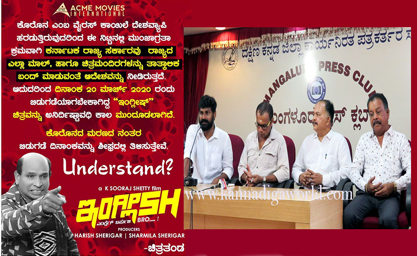 ಈ ಹಿನ್ನೆಲೆಯಲ್ಲಿ ಮಾರ್ಚ್ 20ರಂದು ದಕ್ಷಿಣ ಕನ್ನಡ, ಉಡುಪಿ ಹಾಗೂ ಗಲ್ಫ್‌ ರಾಷ್ಟ್ರಗಳಲ್ಲಿ ಬಿಡುಗಡೆಯಾಗ ಬೇಕಾಗಿದ್ದಇಂಗ್ಲಿಷ್” ತುಳು ಸಿನಿಮಾ ಬಿಡುಗಡೆಯನ್ನು ಮುಂದೂಡಲಾಗಿದೆ. ನಮ್ಮ ನಿರ್ಮಾಪರಾದ ಶ್ರೀ ಹರೀಶ್ ಶೇರಿಗಾರ್ ಅವರ ಇಚ್ಚೆಯಂತೆ ಚಿತ್ರಮಂದಿರದ ವಿಚಾರದಲ್ಲಿ ಯಾರಿಗೂ ತೊಂದರೆಯಾಗದಂತೆ ನೋಡಿಕೊಂಡು ಚಿತ್ರ ಬಿಡುಗಡೆಯ ಮುಂದಿನ ದಿನಾಂಕವನ್ನು ತಿಳಿಸಲಾಗುವುದು ಎಂದು ತಿಳಿಸಿದರು.