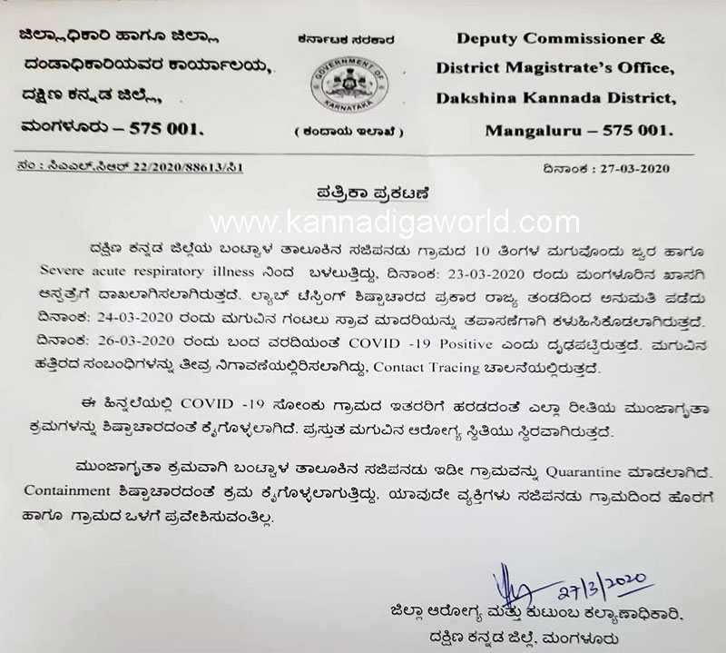 ಬಂಟ್ವಾಳ, ಮಾರ್ಚ್.27 : ಬಂಟ್ವಾಳ ತಾಲೂಕಿನಲ್ಲಿ 10 ತಿಂಗಳ ಮಗುವಿಗೆ ಕೋವಿಡ್ -19 (ಕೊರೋನ) ಸೊಂಕು ತಗಲಿರುವುದು ದೃಡಪಟ್ಟಿದೆ ಎಂದು ದಕ್ಷಿಣ ಕನ್ನಡ ಜಿಲ್ಲಾಧಿಕಾರಿಯವರ ಕಾರ್ಯಾಲಯದ ಪ್ರಕಟನೆ ತಿಳಿಸಿದೆ.