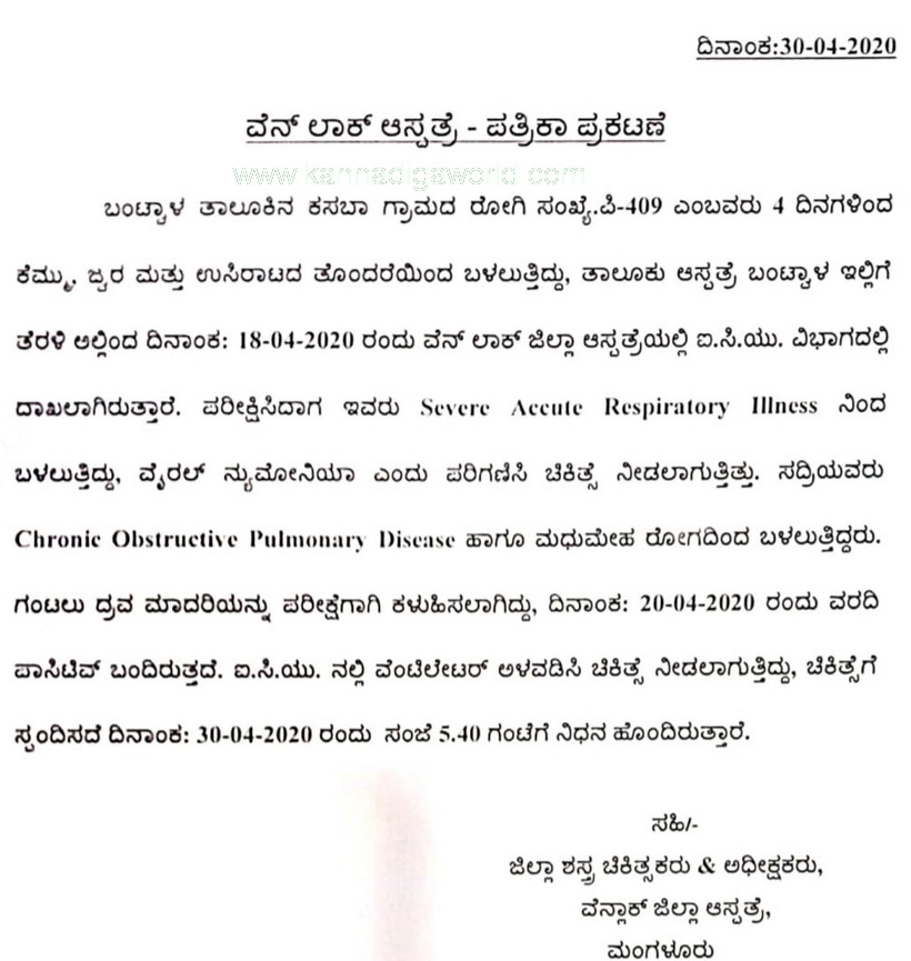 ತೀವ್ರ ಉಸಿರಾಟದ ಸಮಸ್ಯೆಯಿಂದ ಬಳಲುತ್ತಿದ್ದ ಈ ಮಹಿಳೆಯನ್ನು ಎಪ್ರಿಲ್ 18ರಂದು ಮಂಗಳೂರು ಕೋವಿಡ್ ಆಸ್ಪತ್ರೆಗೆ ದಾಖಲಿಸಿ ಚಿಕಿತ್ಸೆ ನೀಡಲಾಗುತ್ತಿತ್ತು. ಕೋವಿಡ್ – 19 ಪರೀಕ್ಷೆಗೆ ಕಳುಹಿಸಿದ್ದ ಇವರ ಗಂಟಲ ದ್ರವ ಮಾದರಿಯ ವರದಿಯಲ್ಲಿ ಪಾಸಿಟಿವ್ ಬಂದಿತ್ತು.