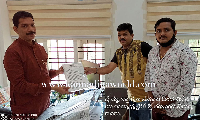 ಮಂಗಳೂರು : ರಾಜ್ಯ ಬಿಜೆಪಿ ಉಪಾಧ್ಯಕ್ಷ, ವಿಧಾನ ಪರಿಷತ್ ಸದಸ್ಯ ಕೆ.ಪಿ.ನಂಜುಂಡಿ ಅವರು ಸಾಮಾಜಿಕ ಜಾಲತಾಣ ಫೇಸ್‌ಬುಕ್ ಲೈವ್‌ನಲ್ಲಿ ದೈವಜ್ಞ ಬ್ರಾಹ್ಮಣ ಸಮಾಜದ ವಿರುದ್ಧ ಅವಹೇಳನಕಾರಿಯಾಗಿ ಮಾತನಾಡಿದ್ದಾರೆ ಎಂದು ಆರೋಪಿಸಲಾಗಿದ್ದು, ಅವರನ್ನು ಆ ಸ್ಥಾನದಿಂದ ತೆರವುಗೊಳಿಸುವಂತೆ ಆಗ್ರಹಿಸಿ ಮಂಗಳೂರು ದೈವಜ್ಞ ಬ್ರಾಹ್ಮಣ ಸಂಘದಿಂದ ಬಿಜೆಪಿ ರಾಜ್ಯಾಧ್ಯಕ್ಷ, ಸಂಸದ ನಳಿನ್ ಕುಮಾರ್ ಕಟೀಲ್ ಅವರಿಗೆ ಮನವಿ ಸಲ್ಲಿಸಲಾಯಿತು.