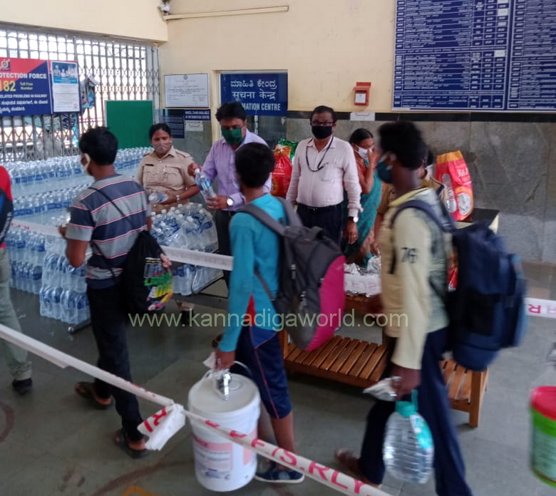 ರೈಲು ನಿಲ್ದಾಣದಲ್ಲಿ ವಲಸೆ ಕಾರ್ಮಿಕರಿಗೆ ಉಚಿತ ಊಟದ ಪೊಟ್ಟಣ ಹಾಗೂ ನೀರಿನ ಬಾಟಲ್ಗಳನ್ನು ವಿತರಿಸಲಾಗಿದೆ.