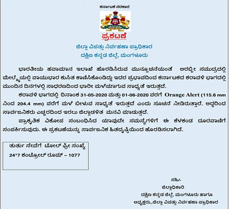 ಕರಾವಳಿ ಭಾಗದಲ್ಲಿ ಭಾರೀ ಮಳೆಯಾಗುವ ಮುನ್ಸೂಚನೆ ಇರುವ ಕಾರಣ ಮುಂಜಾಗ್ರತಾ ದೃಷ್ಟಿಯಿಂದ ದ.ಕ. ಜಿಲ್ಲಾಡಳಿತ 24 ಗಂಟೆಗಳ ಕಂಟ್ರೋಲ್‌ ರೂಂ. ವ್ಯವಸ್ಥೆ ಕಲ್ಪಿಸಿದೆ. ಪ್ರಾಕೃತಿಕ ವಿಕೋಪ ಸಂಬಂಧಿಸಿದ ಯಾವುದೇ ಸಮಸ್ಯೆಗಳಿಗೆ 1077ಗೆ ಕರೆ ಮಾಡಬಹುದಾಗಿದೆ ಎಂದು ದ.ಕ. ಜಿಲ್ಲಾಧಿಕಾರಿ ಸಿಂಧೂ ಬಿ. ರೂಪೇಶ್‌ ತಿಳಿಸಿದ್ದಾರೆ.