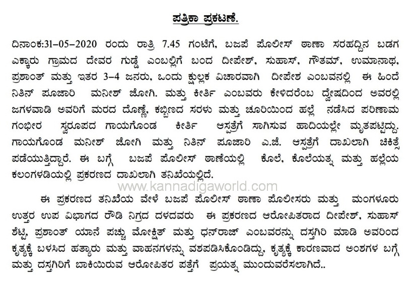 ಮೇ 31ರಂದು ರಾತ್ರಿ ಮೂಡಬಿದ್ರೆ ತಾಲೂಕಿನ ಕಟೀಲು ಸಮೀಪದ ಎಕ್ಕಾರು ದೇವರಗುಡ್ಡೆಯಲ್ಲಿ ಎರಡು ತಂಡಗಳ ಮಧ್ಯೆ ತಲ್ವಾರ್ ದಾಳಿ ನಡೆದಿದ್ದು ಈ ಸಂದರ್ಭ ಕೀರ್ತನ್ ನನ್ನು ತಲವಾರಿನಿಂದ ಕಡಿದು ಹತ್ಯೆಗೈಯಲಾಗಿತ್ತು. ದಾಳಿಯಲ್ಲಿ ಕೀರ್ತನ್ ಜೊತೆಗಿದ್ದ ಅತನ ಸ್ನೇಹಿತರಾದ ನಿತಿನ್ ಪೂಜಾರಿ (20), ಮನೀಶ್ ಜೋಗಿ(20) ಗಂಭೀರ ಗಾಯಗೊಂಡಿದ್ದು ಅವರನ್ನು ಮಂಗಳೂರಿನ ಖಾಸಗಿ ಆಸ್ಪತ್ರೆಗೆ ದಾಖಲಿಸಿ ಚಿಕಿತ್ಸೆ ನೀಡಲಾಗುತಿದೆ..