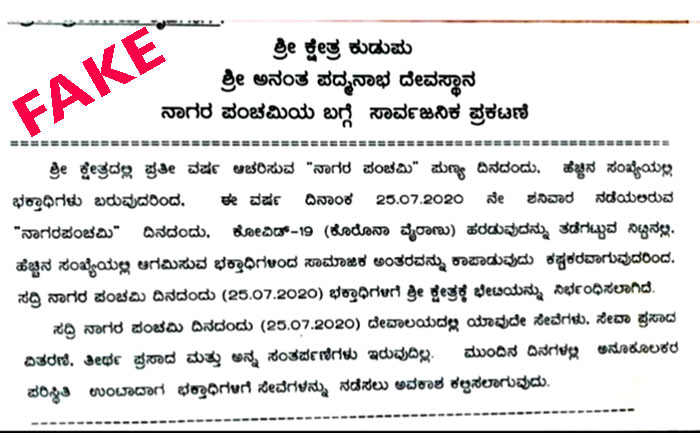 ಹಾಗಾಗಿ ನಾಗರ ಪಂಚಮಿಯಂದು ಭಕ್ತಾಧಿಗಳಿಗೆ ಕ್ಷೇತ್ರಕ್ಕೆ ಭೇಟಿಗೆ ನಿರ್ಭಂಧಿಸಲಾಗಿದೆ. ಹಾಗೆಯೇ ದೇವಾಲಯದಲ್ಲಿ ಯಾವುದೇ ಸೇವೆಗಳು, ಸೇವಾ ಪ್ರಸಾದ ವಿತರಣೆ, ತೀರ್ಥ ಪ್ರಸಾದ ಹಾಗೂ ಅನ್ನ ಸಂತರ್ಪಣೆಗಳು ಇರುವುದಿಲ್ಲ. ಮುಂದಿನ ದಿನಗಳಲ್ಲಿ ಅನುಕೂಲಕರ ಪರಿಸ್ಥಿತಿ ಉಂಟಾದಾಗ ಭಕ್ತಾಧಿಗಳಿಗೆ ಸೇವೆಗಳನ್ನು ನಡೆಸಲು ಅವಕಾಶ ಕಲ್ಪಿಸಲಾಗುವುದು” ಎಂಬ ಬರಹವು ದೇವಸ್ಥಾನದಿಂದ ನೀಡಲಾದ ಪ್ರಕಟಣೆ ಎಂಬಂತೆ ಬಿಂಬಿಸಿ ಹರಿಯ ಬಿಡಲಾಗಿದ್ದು, ಈ ಬಗ್ಗೆ ಸ್ಪಷ್ಟನೆ ನೀಡಿರುವ ಮುಜರಾಯಿ ಅಧಿಕಾರಿಗಳು ಇಂತಹ ಯಾವುದೇ ಪ್ರಕಟಣೆ ದೇವಸ್ಥಾನದಿಂದ ನೀಡಿರುವುದಿಲ್ಲ ಎಂದು ತಿಳಿಸಿದ್ದಾರೆ.