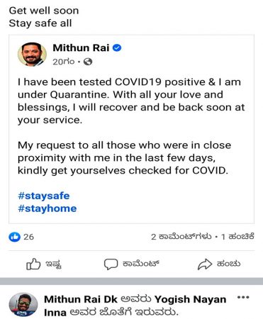 ದ.ಕ. ಜಿಲ್ಲಾ ಯುವ ಕಾಂಗ್ರೆಸ್ ಅಧ್ಯಕ್ಷ ಮಿಥುನ್ ರೈಯವರಿಗೆ ಪಾಸಿಟಿವ್ : ಬೆಂಗಳೂರಿನಲ್ಲಿ ಕ್ವಾರಂಟೈನ್