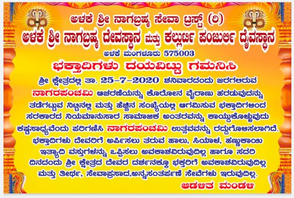 ಅಳಕೆ : ನಾಗರಪಂಚಮಿ ಆಚರಣೆ ರದ್ಧು – ದೇಗುಲಕ್ಕೆ ಭಕ್ತರ ಪ್ರವೇಶ ನಿರ್ಬಂಧ