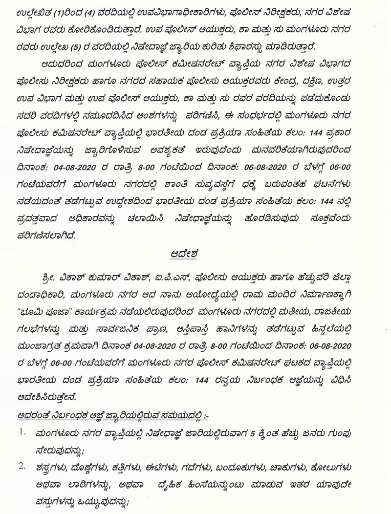 ಅಯೋಧ್ಯೆಯಲ್ಲಿ ನಿರ್ಮಾಣವಾಗಲಿರುವ ರಾಮಮಂದಿರದ ಭೂಮಿಪೂಜೆಯು ಆ.5ರಂದು ನೆರವೇರಲಿದ್ದು, ಅಂದು ಹಿಂದೂ ಸಂಘಟನೆಗಳು ಸಂಭ್ರಮಾಚರಣೆ ನಡೆಸಲು ಸಿದ್ದತೆ ನಡೆಸಿದೆ ಹಾಗೂ ಮುಸ್ಲಿಂ ಸಂಘಟನೆಗಳಿಂದ ಪ್ರತಿಭಟನೆ ನಡೆಸಲು ಸಿದ್ಧತೆ ನಡೆದಿದೆ ಎಂಬ ಬಗ್ಗೆ ಮಾಹಿತಿ ಲಭಿಸಿದ ಹಿನ್ನೆಲೆಯಲ್ಲಿ ಮಂಗಳೂರಲ್ಲಿ ಮತೀಯ, ರಾಜಕೀಯ ಗಲಭೆ ಗಳನ್ನು ನಿಯಂತ್ರಿಸಲು ಹಾಗೂ ಸಾರ್ವಜನಿಕ ಪ್ರಾಣ, ಆಸ್ತಿಪಾಸ್ತಿ ಹಾನಿ ತಡೆಗಟ್ಟುವ ಹಿನ್ನೆಲೆಯಲ್ಲಿ ಮುಂಜಾಗ್ರತಾ ಕ್ರಮವಾಗಿ ನಿಷೇಧಾಜ್ಷೆ ವಿಧಿಸಿರುವುದಾಗಿ ಮಂಗಳೂರು ಪೊಲೀಸ್ ಆಯುಕ್ತ ವಿಕಾಶ್ಕುಮಾರ್ ಆದೇಶದಲ್ಲಿ ಉಲ್ಲೇಖಿಸಿದ್ದಾರೆ.