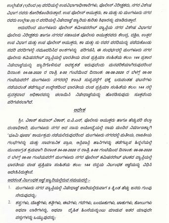 ಅಯೋಧ್ಯೆಯಲ್ಲಿ ಭೂಮಿ ಪೂಜೆ ಹಿನ್ನಲೆ : ಮಂಗಳೂರಿನಲ್ಲಿ ನಿಷೇಧಾಜ್ಞೆ ಜ್ಯಾರಿ