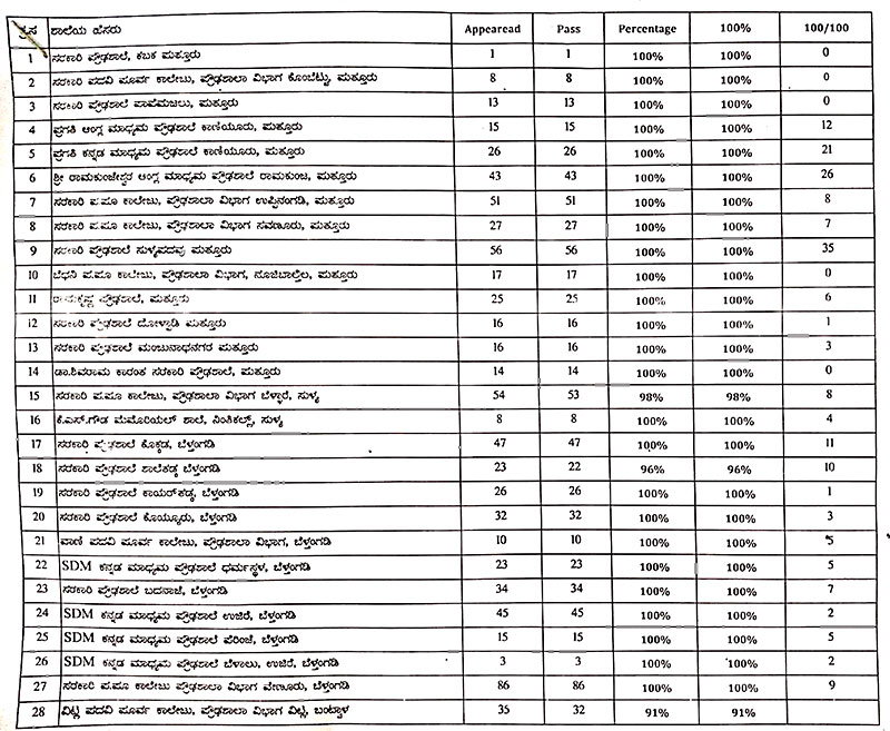 ಈ ಪೈಕಿ ಎಸ್.ಎಸ್.ಎಲ್.ಸಿ ಪರೀಕ್ಷೆ ಬರೆದ 39 ಶಾಲೆಗಳ ಒಟ್ಟು 924 ವಿದ್ಯಾರ್ಥಿಗಳಲ್ಲಿ 917 ವಿದ್ಯಾರ್ಥಿಗಳು ಪಾಸಾಗಿದ್ದು ಶೇಕಡಾ 99% ಫಲಿತಾಂಶ ದಾಖಲಿಸಿದ್ದಾರೆ. 234 ವಿದ್ಯಾರ್ಥಿಗಳು 100 ಕ್ಕೆ 100 ಅಂಕ ಪಡೆದಿರುತ್ತಾರೆ.