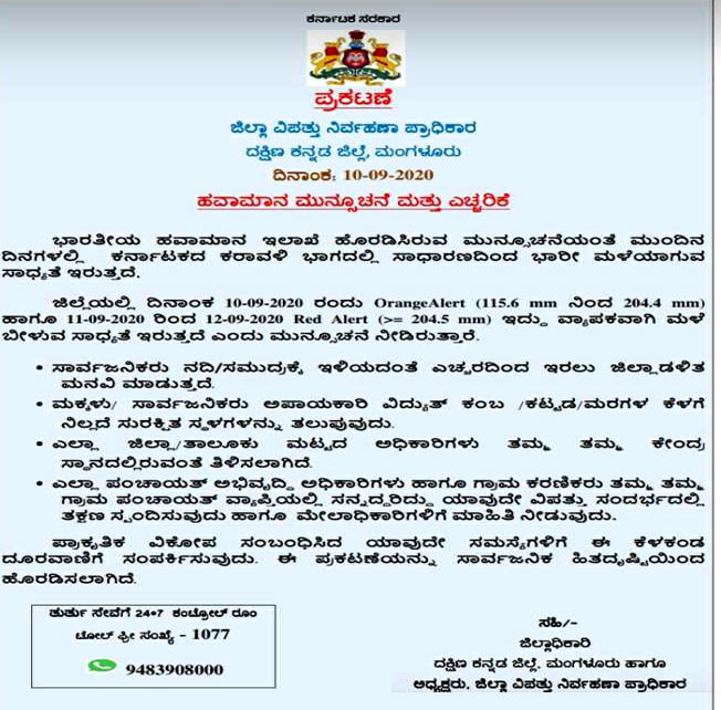 ಈ ನಿಟ್ಟಿನಲ್ಲಿ ಜಿಲ್ಲೆಯಲ್ಲಿ ಸೆ.10ರಂದು ಆರೆಂಜ್ ಆಲರ್ಟ್, ಹಾಗೂ ಸೆ.11ರಿಂದ 12ರ ವರೆಗೆ ರೆಡ್ ಆಲರ್ಟ್ ಘೋಷಿಸಲಾಗಿದೆ. ಈ ಹಿನ್ನಲೆಯಲ್ಲಿ ಕರ್ನಾಟಕ ರಾಜ್ಯ ನೈಸರ್ಗಿಕ ವಿಕೋಪ ಉಸ್ತುವಾರಿ ಕೇಂದ್ರ ಬೆಂಗಳೂರು ಇವರ ಮುನ್ಸೂಚನೆಯಂತೆ ಜಿಲ್ಲಾ ವಿಪತ್ತು ನಿರ್ವಹಣಾ ಪ್ರಾಧಿಕಾರ ಮುಂಜಾಗ್ರತಾ ಕ್ರಮವಾಗಿ ದ.ಕ.ಜಿಲ್ಲೆಯ ಸಾರ್ವಜನಿಕರಿಗೆ ಈ ಕೆಳಗಿನ ಸೂಚನೆ ಗಳನ್ನು ನೀಡಿದೆ.