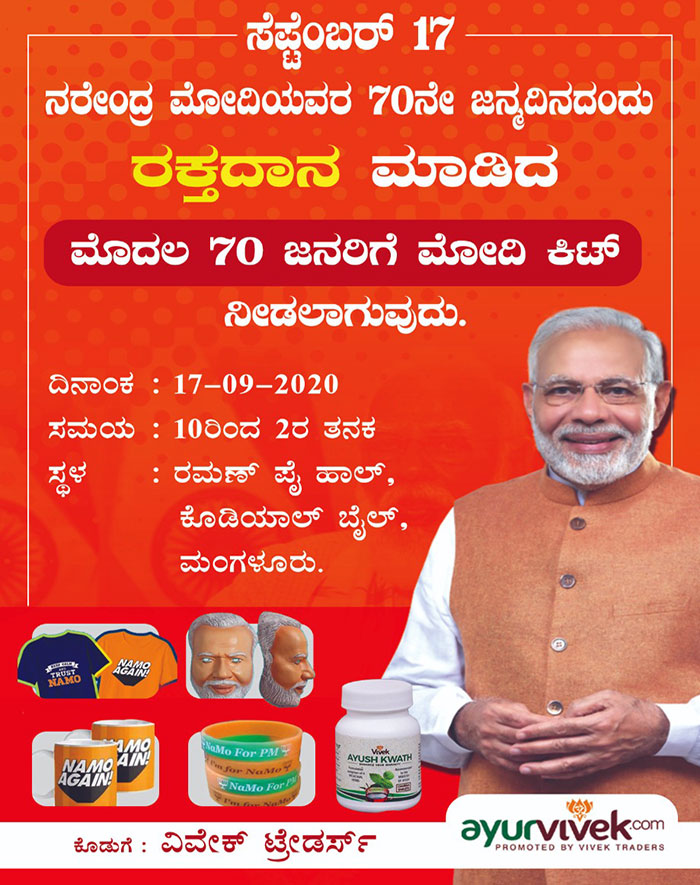 ಮೋದಿಜಿಯವರ ಜನ್ಮದಿನದಂದೇ ಈ ಶಿಬಿರ ನಡೆಯಲಿದ್ದು ಬೆಳಿಗ್ಗೆ 10 ಗಂಟೆಗೆ ಗಣ್ಯರು ಉದ್ಘಾಟಿಸಲಿದ್ದಾರೆ. ಮೋದಿಜಿಯವರ 70ನೇ ಜನ್ಮದಿನವಾಗಿರುವುದರಿಂದ ಆಂದು ರಕ್ತದಾನ ಮಾಡಲು ಬರುವ ಮೊದಲ 70 ರಕ್ತದಾನಿಗಳಿಗೆ ಮೋದಿಜಿಯವರ ಆಕರ್ಷಕ ಚಿತ್ರವಿರುವ ಉತ್ತಮ ಗುಣಮಟ್ಟದ ಟೀ ಶರ್ಟ್, ಮಾಸ್ಕ್, ರಿಸ್ಟ್ ಬ್ಯಾಂಡ್, ಮಗ್ಗ್ ಮತ್ತು ಕೇಂದ್ರ ಸರಕಾರದ ಆಯುಷ್ ಇಲಾಖೆಯಿಂದ ಪ್ರಮಾಣೀಕೃತ ಒಂದು ತಿಂಗಳಿ ಗಾಗುವಷ್ಟು ಆಯುಷ್ ಕ್ವಾಥ್ ಚೂರ್ಣವನ್ನು ನೀಡಲಾಗುವುದು ಎಂದು ಆಯೋಜಕರು ತಿಳಿಸಿದ್ದಾರೆ.
