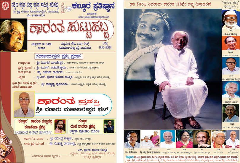 ‘ಕಾರಂತ ಹುಟ್ಟುಹಬ್ಬ ಸಮಾರಂಭವನ್ನು ಮಂಗಳೂರು ಮಹಾನಗರ ಪಾಲಿಕೆಯ ಮಹಾಪೌರ ಶ್ರೀ ದಿವಾಕರ ಪಾಂಡೇಶ್ವರ ಉದ್ಘಾಟಿಸಲಿರುವರು. ಇದೇ ಸಂದರ್ಭ ಶಿವರಾಮ ಕಾರಂತರ ನಿಕಟವರ್ತಿ ಸಾಹಿತಿ ಶ್ರೀ ಪಡಾರು ಮಹಾಬಲೇಶ್ವರ ಭಟ್ ಅವರಿಗೆ ಕಾರಂತ ಪ್ರಶಸ್ತಿ ನೀಡಿ ಗೌರವಿಸಲಾಗುವುದು.