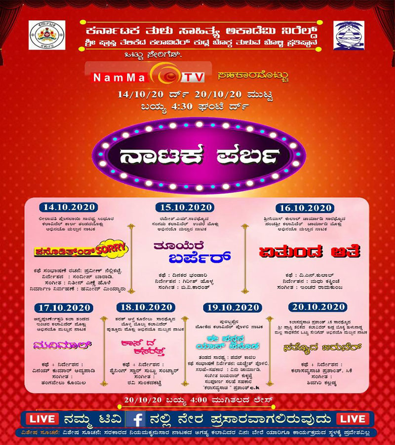 ದಿನಾಂಕ 20-10-2020ರಂದು ನಾಟಕ ಪರ್ಬದ ಸಮಾರೋಪ ಸಮಾರಂಭ ನಡೆಯಲಿರುವುದು. ಸರಕಾರದ ನಿಯಮಕ್ಕನುಸಾರ ನಾಟಕದ ಅಗತ್ಯ ಕಲಾವಿದರ ವಿನಃ ಬೇರೆ ಯಾರಿಗೂ ಕಾರ್ಯಕ್ರಮದ ಸ್ಥಳಕ್ಕೆ ಪ್ರವೇಶವಿಲ್ಲ. ಕಾರ್ಯಕ್ರಮವು ನಮ್ಮ ಟಿ.ವಿ, ಫೇಸ್ಬುಕ್ನಲ್ಲಿ ನೇರಪ್ರಸಾರವಾಗಲಿರುವುದು ಎಂದು ಕರ್ನಾಟಕ ತುಳು ಸಾಹಿತ್ಯ ಅಕಾಡೆಮಿಯ ರಿಜಿಸ್ಟ್ರಾರ್ ರಾಜೇಶ್. ಜಿ ಇವರು ತಿಳಿಸಿದ್ದಾರೆ.