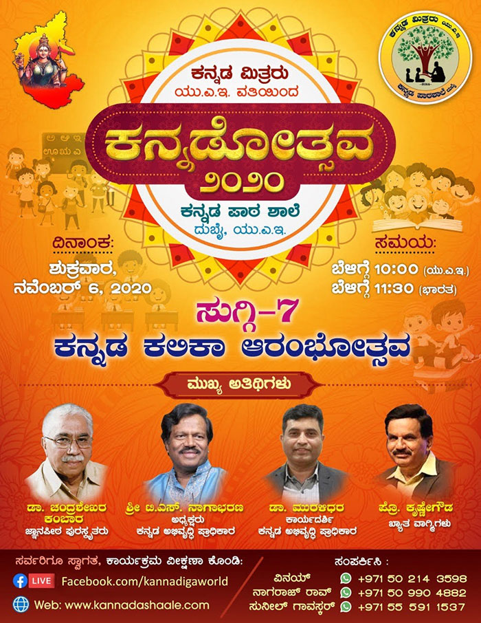 ದುಬೈ : “ಕನ್ನಡ ಮಿತ್ರರು ಯು ಎ ಇ” ವತಿಯಿಂದ ಕನ್ನಡೋತ್ಸವ- ೨೦೨೦, ಕನ್ನಡ ಪಾಠ ಶಾಲೆ -ಕನ್ನಡ ಕಲಿಕಾ ಆರೋಭವತ್ಸವ ಸುಗ್ಗಿ-7, ಯುಎಇ ದುಬೈಯಲ್ಲಿ ನವೆಂಬರ್ 6, ಶುಕ್ರವಾರದಂದು ಆರಂಭಗೊಳ್ಳಲಿದೆ.