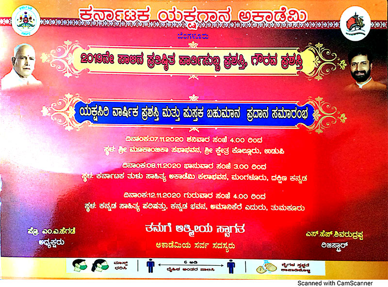 ಮಂಗಳೂರು, ನವೆಂಬರ್.07: ಕರ್ನಾಟಕ ಯಕ್ಷಗಾನ ಅಕಾಡೆಮಿ ಬೆಂಗಳೂರು ಇವರು ನೀಡುವ 2019ನೇ ಸಾಲಿನ ಗೌರವ ಪ್ರಶಸ್ತಿ ಹಾಗೂ ಯಕ್ಷಸಿರಿ ವಾರ್ಷಿಕ ಪ್ರಶಸ್ತಿ ಮತ್ತು ಪುಸ್ತಕ ಬಹುಮಾನ ಪ್ರಧಾನ ಸಮಾರಂಭ ನವಂಬರ್ 8ರಂದು ಸಂಜೆ 3ಕ್ಕೆ ಕರ್ನಾಟಕ ತುಳು ಸಾಹಿತ್ಯ ಅಕಾಡೆಮಿ ಕಲಾಭವನ ಮಂಗಳೂರು ಇಲ್ಲಿ ಜರಗಲಿದೆ.