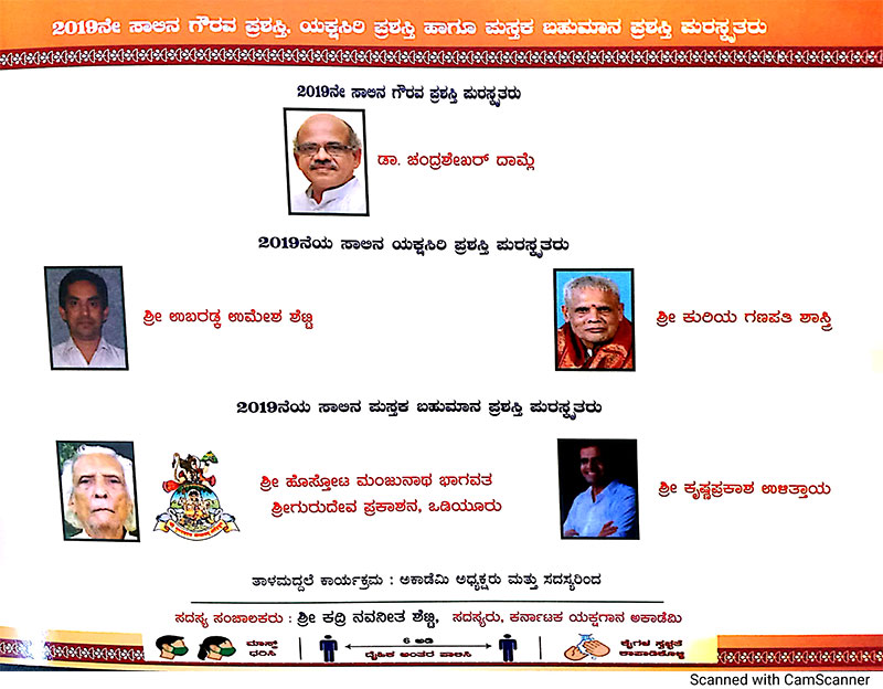ಯಕ್ಷಸಿರಿ ಪ್ರಶಸ್ತಿಯನ್ನು ಉಬರಡ್ಕ ಉಮೇಶ್ ಶೆಟ್ಟಿ ಮತ್ತು ಭಾಗವತ ಕುರಿಯ ಗಣಪತಿ ಶಾಸ್ತ್ರಿಯವರಿಗೂ, ಪುಸ್ತಕ ಬಹುಮಾನ ಪ್ರಶಸ್ತಿಯನ್ನು ಶ್ರೀ ಹೊಸ್ತೋಟ ಮಂಜುನಾಥ ಭಾಗವತ(ಒಡಿಯೂರು ಶ್ರೀ ಗುರುದೇವ ಪ್ರಕಾಶನದ ಮೂಲಕ ಪ್ರಕಾಶಿಸಲ್ಪಟ್ಟ ‘ವೀರಾಂಜನೆಯ ವೈಭವ’ ಪ್ರಸಂಗ ಸಂಪುಟ) ಮತ್ತು ಕೃಷ್ಣ ಪ್ರಕಾಶ ಉಳಿತ್ತಾಯ(ಅಗರಿ ಮಾರ್ಗ ಕೃತಿಗಾರ) ಅವರಿಗೂ ನೀಡಿ ಗೌರವಿಸಲಾಗುವುದು.