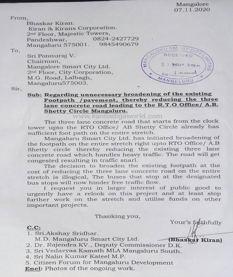 ಈ ನಿರ್ಧಾರ ತರ್ಕಬದ್ಧವಲ್ಲ. ಗೊತ್ತುಪಡಿಸಿದ ಬಸ್ ನಿಲ್ದಾಣಗಳಲ್ಲಿ ನಿಲ್ಲುವ ಬಸ್ಸುಗಳ ಸುಗಮಸಂಚಾರಕ್ಕೆ ಅಡ್ಡಿಯಾಗುತ್ತವೆ ಎಂದು ಆರೋಪಿಸಿರುವ ಭಾಸ್ಕರ್ ಕಿರಣ್ ಅವರು ಈ ಕೆಲಸವನ್ನು ತಕ್ಷಣವೇ ನಿಲ್ಲಿಸುವಂತೆ ಮಂಗಳೂರು ಸ್ಮಾರ್ಟ್ ಸಿಟಿ ಲಿಮಿಟೆಡ್ನ ಅಧ್ಯಕ್ಷರಾದ ಶ್ರೀ ಪೊನ್ನುರಾಜ್ ವಿ ಅವರಿಗೆ ಮನವಿ ಸಲ್ಲಿಸಿದ್ದಾರೆ.