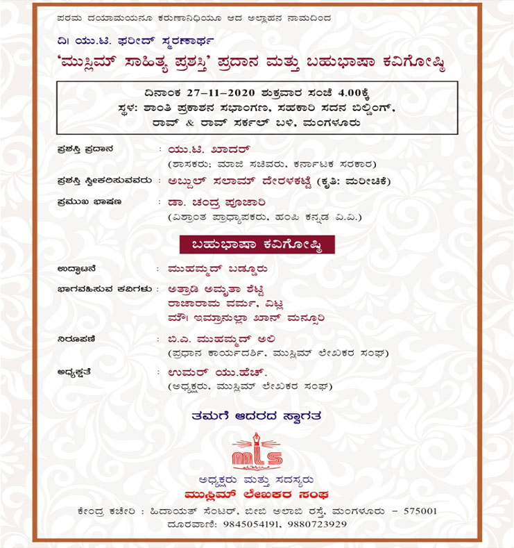 ಮಂಗಳೂರು : ಮುಸ್ಲಿಮ್ ಬರಹಗಾರರ ಅತ್ಯುತ್ತಮ ಕೃತಿಗೆ ಮುಸ್ಲಿಮ್ ಲೇಖಕರ ಸಂಘವು ಕೊಡಮಾಡುವ 2018ನೇ ಸಾಲಿನ ರಾಜ್ಯ ಮಟ್ಟದ ದಿl ಯು.ಟಿ. ಫರೀದ್ ಸ್ಮರಣಾರ್ಥ ‘ಮುಸ್ಲಿಮ್ ಸಾಹಿತ್ಯ ಪ್ರಶಸ್ತಿ’ ಪ್ರದಾನ ಸಮಾರಂಭ ಮತ್ತು ಬಹುಭಾಷಾ ಕವಿಗೋಷ್ಠಿ ಇಂದು (ನ. 27) ಸಂಜೆ ನಡೆಯಲಿದೆ.