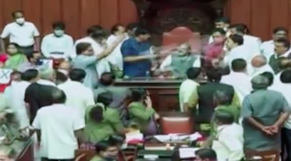 ಪರಿಷತ್ ಅಧಿವೇಶನ ಆರಂಭವಾಗುವ ಕುರಿತು ಬೆಲ್ ಆಗುತ್ತಿದ್ದಂತೆ ಉಪ ಸಭಾಪತಿ ಧರ್ಮೇಗೌಡ ಆಸನದಲ್ಲಿ ಕುಳಿತರು. ಇದಕ್ಕೆ ಕಾಂಗ್ರೆಸ್ ಸದ್ಯಸ್ಯರು ವಿರೋಧ ವ್ಯಕ್ತಪಡಿಸಿದ್ದು ಪೀಠದ ಮುಂದೆ ಎರಡು ಪಕ್ಷದ ನಾಯಕರು ಪರಸ್ಪರ ಎಳೆದಾಡಿಕೊಂಡಿದ್ದಾರೆ. ತಳ್ಳಾಟ ನೂಕಾಟದ ಮಧ್ಯೆ ಬಿಜೆಪಿ ಸದಸ್ಯರು ಉಪ ಸಭಾಪತಿಗೆ ರಕ್ಷಣೆ ನೀಡಿದ್ದಾರೆ.