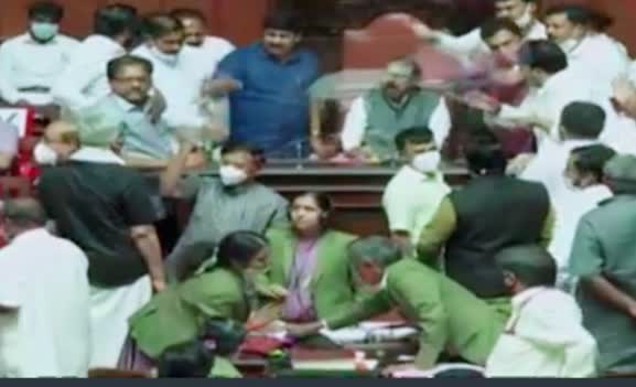 ಕಾಂಗ್ರೆಸ್, ಬಿಜೆಪಿ ಸದಸ್ಯರು ಉಪ ಸಭಾಪತಿಯವರನ್ನು ಎಳೆದಾಡಿದ್ದು, ಬಳಿಕ ಮಾರ್ಷಲ್ಗಳು ಆಗಮಿಸಿ ಉಪ ಸಭಾಪತಿಗಳಿಗೆ ರಕ್ಷಣೆ ನೀಡಿದ್ದಾರೆ. ಬಿಜೆಪಿ ಸದಸ್ಯರು ಸಹ ಸಭಾಪತಿ ಪೀಠಕ್ಕೆ ಬರದಂತೆ ಅಡ್ಡ ನಿಂತಿದ್ದಾರೆ. ಈ ವೇಳೆ ಪೀಠದ ಮೇಲೆ ಇಬ್ಬರು ಪಕ್ಷದ ಸದಸ್ಯರು ಕುಳಿತು ಅಪಮಾನ ಮಾಡಿದ್ದಾರೆ. ಬಳಿಕ ಪೀಠದ ಮೇಲೆಯೇ ತಳ್ಳಾಟ ನೂಕಾಟ ನಡೆದಿದೆ. ಈ ವೇಳೆ ಕಾಂಗ್ರೆಸ್ ಸದಸ್ಯ ಪೀಠದ ಮೇಲೆ ಕುಳಿತಿದ್ದಾರೆ. ಉಪ ಸಭಾಪತಿ ಕುಳಿತುಕೊಳ್ಳಲು ಕಾಂಗ್ರೆಸ್ ಸದಸ್ಯರು ಅವಕಾಶ ನೀಡಿಲ್ಲ.