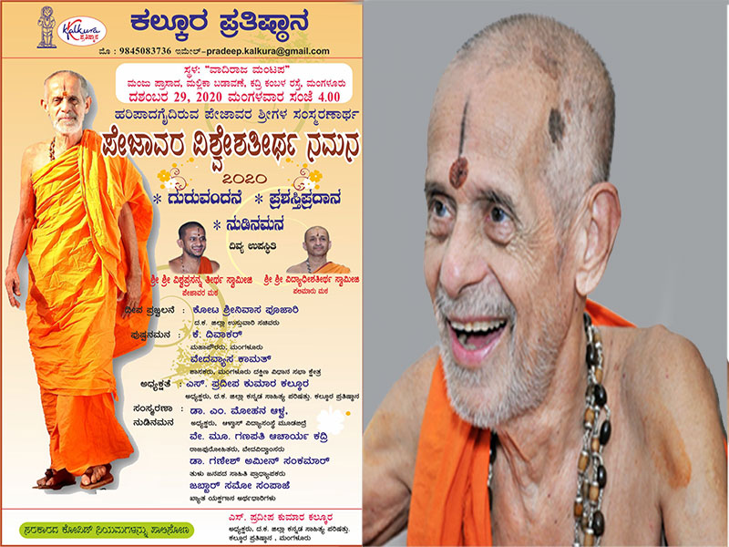 ಮಂಗಳೂರು, ಡಿಸೆಂಬರ್.28: ಹರಿಪಾದಗೈದಿರುವ ಪೇಜಾವರ ವಿಶ್ವೇಶತೀರ್ಥ ಶ್ರೀಪಾದರ ಸಂಸ್ಮರಣಾರ್ಥ ಕಲ್ಕೂರ ಪ್ರತಿಷ್ಠಾನವು ಪೇಜಾವರ ವಿಶ್ವೇಶತೀರ್ಥ ನಮನ-2020ಕಾರ್ಯಕ್ರಮವನ್ನು ಹಮ್ಮಿಕೊಂಡಿದೆ.