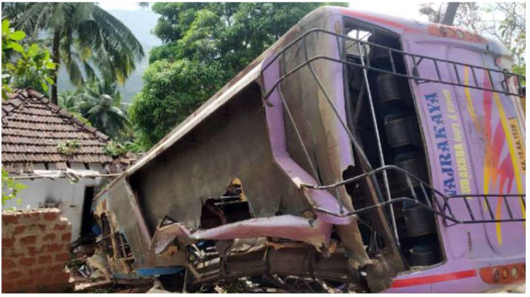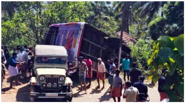 ದಕ್ಷಿಣಕನ್ನಡದ ಗಡಿಗೆ ಹೊಂದಿಕೊಂಡಿರುವ ಕಾಸರಗೋಡು ಜಿಲ್ಲೆಯ ರಾಜಪುರಂ ಬಳಿ ಕೊಡಗಿನಿಂದ ಮದುವೆ ಸಮಾರಂಭಕ್ಕೆ ಹೊರಟಿದ್ದ ಬಸ್ ಆಕಸ್ಮಿಕ ಅಪಘಾತವಾಗಿ ಪಲ್ಟಿ ಹೊಡೆದು ಮನೆ ಮೇಲೆ ಬಿದ್ದಿದೆ.