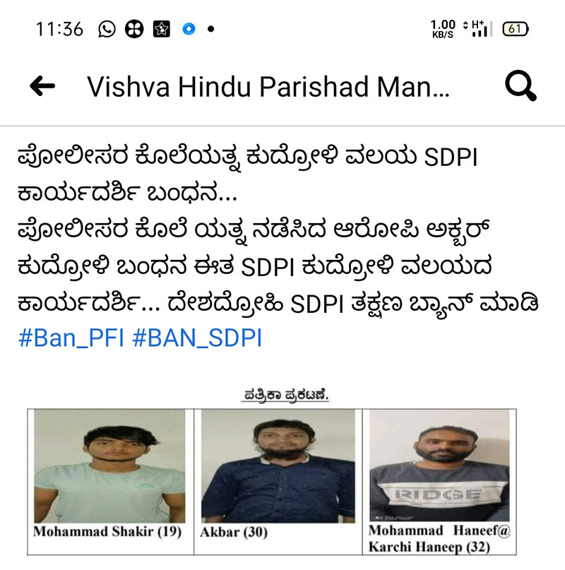 ಆದರಿಂದ ಗ್ರಹ ಇಲಾಖೆ, ಪೊಲೀಸ್ ಇಲಾಖೆ ಈ ಪ್ರಕರಣವನ್ನು ಗಂಭೀರವಾಗಿ ಪರಿಗಣಿಸಿ ಎಸ್ಡಿಪಿಐ ಮತ್ತು ಪಿಎಫ್ಐ ಸಂಘಟನೆಗಳ ಮೇಲೆ ನಿರ್ಬಂಧ ಹೇರಲು ಕ್ರಮ ತೆಗೆದುಕೊಳ್ಳಬೇಕೆಂದು ವಿಶ್ವ ಹಿಂದು ಪರಿಷದ್ ಜಿಲ್ಲಾ ಕಾರ್ಯದರ್ಶಿ ಶಿವಾನಂದ್ ಮೆಂಡನ್ ಪತ್ರಿಕಾ ಪ್ರಕಟಣೆಯಲ್ಲಿ ಆಗ್ರಹಿಸಿದ್ದಾರೆ.
