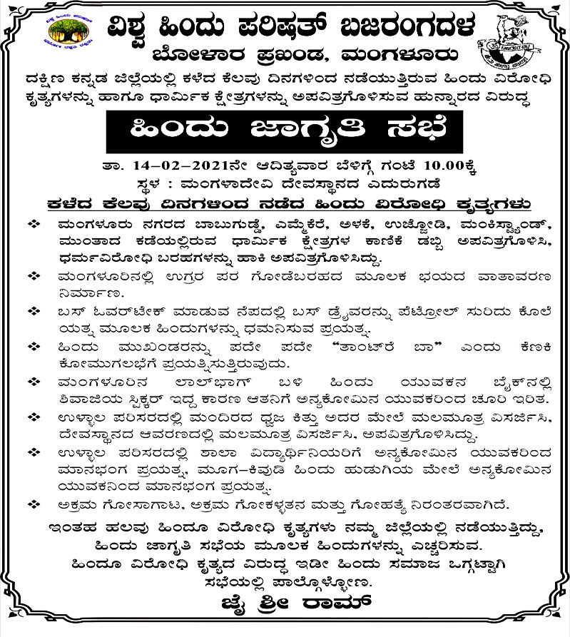 ಮಂಗಳೂರಿನ ಕರಾವಳಿ ಭಾಗದಲ್ಲಿ ನಿರಂತರವಾಗಿ ಧಾರ್ಮಿಕ ಕ್ಷೇತ್ರಗಳನ್ನು ಅಪವಿತ್ರಗೊಳಿಸುವ ಮತ್ತು ಹಿಂದು ವಿರೋಧಿ ಚಟುವಟಿಕೆಗಳು ನಡೆಯುತ್ತಿದ್ದು ಇದನ್ನು ವಿರೋಧಿಸಿ ವಿಶ್ವ ಹಿಂದೂ ಪರಿಷದ್ ಬಜರಂಗದಳ ಬೋಳಾರ ಪ್ರಖಂಡವತಿಯಿಂದ 14/02/2021 ಭಾನುವಾರ ಬೆಳಿಗ್ಗೆ 10 : 00 ಗಂಟೆಗೆ ಮಂಗಳಾದೇವಿ ದೇವಸ್ಥಾನ ಬಳಿ ಹಿಂದು ಜನ ಜಾಗೃತಿ ಸಭೆ ನಡೆಯಲಿದೆ.