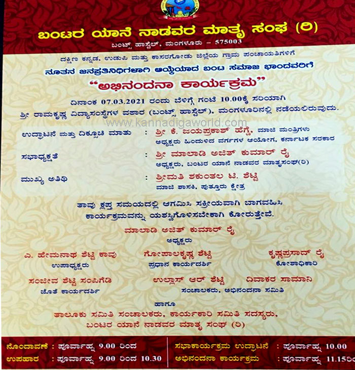 ಮಂಗಳೂರು : ಬಂಟರ ಯಾನೆ ನಾಡವರ ಮಾತೃಸಂಘ(ರಿ) ಬಂಟ್ಸ್ ಹಾಸ್ಟೆಲ್ ಇದರ ಆಶ್ರಯ ದಲ್ಲಿ ದಕ್ಷಿಣ ಕನ್ನಡ, ಉಡುಪಿ, ಕಾಸರಗೋಡು ಜಿಲ್ಲೆಯ ಗ್ರಾಮ ಪಂಚಾಯತ್ಗಳಿಗೆ ನೂತನ ಜನಪ್ರತಿನಿಧಿಗಳಾಗಿ ಆಯ್ಕೆಯಾದ ಬಂಟ ಸಮಾಜದ ಬಾಂಧವರಿಗೆ ಅಭಿನಂದನಾ ಕಾರ್ಯಕ್ರಮವನ್ನು ಮಾರ್ಚ್ 7ರಂದು ಭಾನುವಾರ ಬೆಳಿಗ್ಗೆ 10 ಗಂಟೆಗೆ ಬಂಟ್ಸ್ ಹಾಸ್ಟೇಲ್ ಬಳಿಯ ಶ್ರೀ ರಾಮಕೃಷ್ಣ ವಿದ್ಯಾ ಸಂಸ್ಥೆಗಳ ವಠಾರದಲ್ಲಿ ಜರಗಲಿದೆ.
