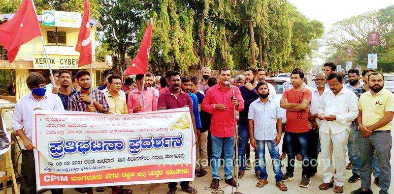 ಮಂಗಳೂರು, ಮಾರ್ಚ್.04: ಪೆಟ್ರೋಲ್ ಡೀಸೆಲ್ ಅಡುಗೆ ಅನಿಲ ಸೇರಿದಂತೆ ಜೀವನಾವಶ್ಯಕ ವಸ್ತುಗಳ ವಿಪರೀತ ಬೆಲೆಯೇರಿಕೆಯನ್ನು ಖಂಡಿಸಿ ಹಾಗೂ ಕೇಂದ್ರ ಸರಕಾರದ ಜನವಿರೋಧಿ ನೀತಿಗಳ ವಿರುದ್ಧ ಸಿಪಿಐಎಂ ನೇತ್ರತ್ವದಲ್ಲಿ ಮಂಗಳೂರು ನಗರದ ಮಿನಿ ವಿಧಾನಸೌಧದ ಎದುರು ಪ್ರತಿಭಟನಾ ಪ್ರದರ್ಶನ ನಡೆಸಲಾಯಿತು.